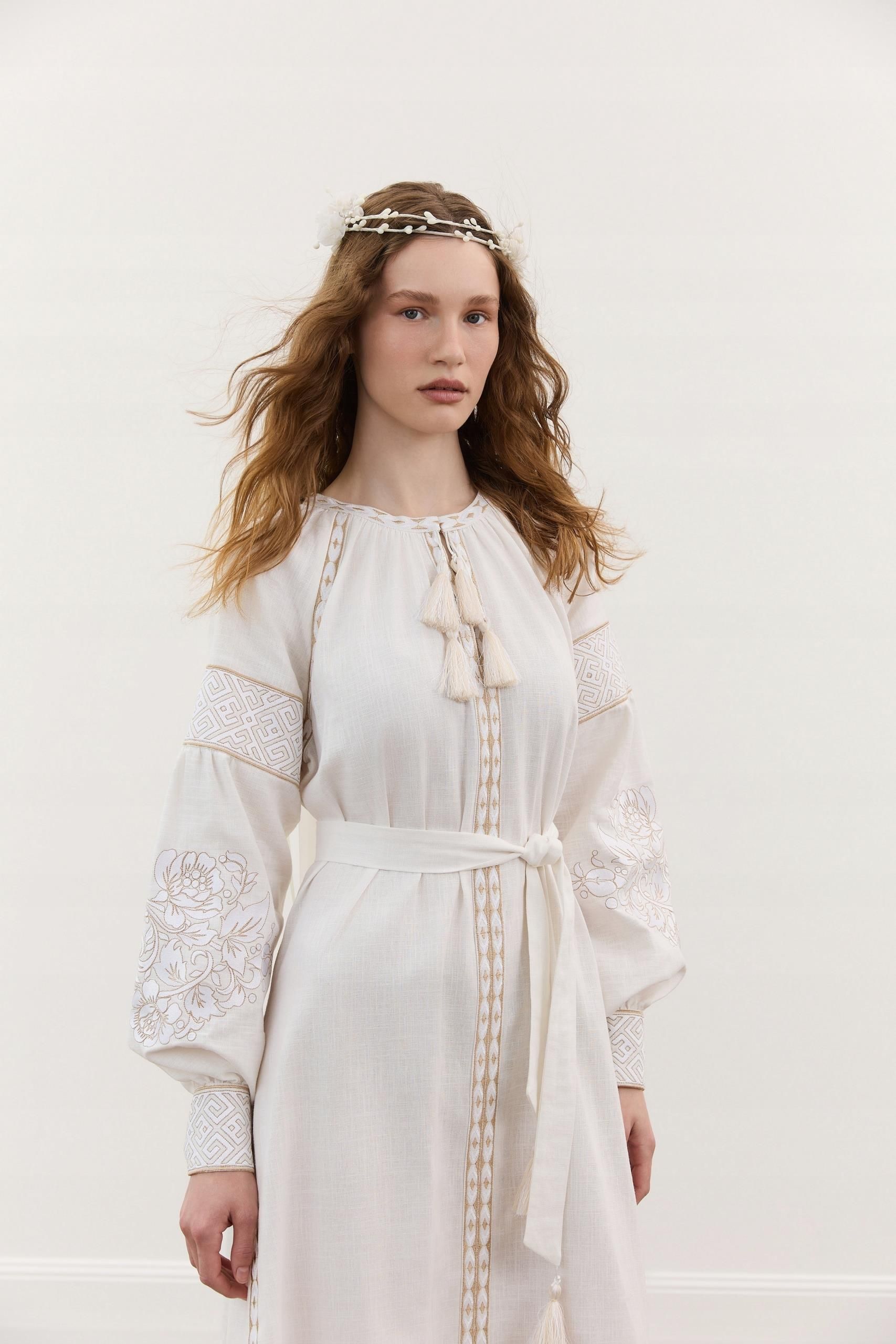 Wyjątkowa suknia - połączenie naturalnej elegancji i ducha dawnych słowiańskich kreacji. Uszyta z tkaniny powstałej z włókien pokrzywy i lnu, zachwyca lekkością, przewiewnością i przyjemnym dotykiem. To materiał w 100% naturalny – przyjazny skórze i środowisku. Suknia ma piękny śmietankowy kolor, który podkreśla delikatność i kobiecość. Zdobiona jest haftem kwiatowym u dołu i na rękawach oraz geometrycznym haftem na mankietach. W zestawie znajduje się pasek, który pozwala dopasować krój do sylwetki i dodać całości lekkości. To idealna propozycja dla kobiet, które cenią autentyczność, komfort i ponadczasowy styl inspirowany słowiańską tradycją. Sprawdzi się doskonale na Ślub Słowiański, uroczystości w naturze czy wyjątkowe wydarzenia. Skład: 85% pokrzywa, 15% len Rozmiar, szerokosc w piersiach, szerokość w talii,szerokość w biodrach, długość rękawa, długośc całkowita XS-S, 54, 51, 58, 68, 148 M-L, 56, 53, 60, 69, 149 XL-XXL, 61, 59, 64, 71, 150 Pojedyncze egzemplarze - dla Wyjątkowych i niepowtarzalnych kreacji.