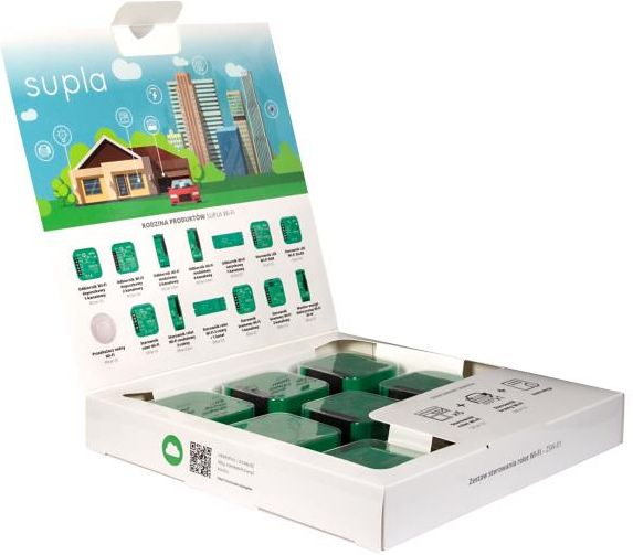 W skład zestawu sterowania rolet Wi-Fi ZSW-01 wchodzą: – 6 szt. sterowników rolet SRW-01, które pozwalają na sterowanie roletami za pomocą przycisków roletowych oraz bezprzewodowej sieci Wi-Fi. Użytkownik może sprawdzić położenie rolety. Możliwe jest też jej zdalne zamknięcie lub otworzenie. Dzięki zapisanym w chmurze harmonogramom możliwe jest automatyczne sterowanie roletą o okreslonej godzinie w wybranym dniu tygodnia. – 1 szt. sterownika bramowy SBW-01, który pozwala na integrację z dowolnym napędem bramowym i umożliwia zdalną kontrolę bramy poprzez aplikację mobilną Supla. Urządzenie przystosowane jest do montażu bezpośrednio w napędzie. Dzięki zasilaniu 24V jest w pełni bezpieczne. Podłączając sygnały z wyłączników krańcowych pod wejścia sterownika otrzymujemy informację o otwarciu i zamknięciu bramy. CECHY FUNKCJONALNE PRODUKTU kompletny zestaw sterowania rolet Wi-Fi (6 szt. sterowników rolet Wi-Fi SRW-01 + 1 szt. sterownika bramowego Wi-Fi SBW-01) możliwość sterowania ręcznego roletami za pomocą przycisków roletowych dla SRW-01 zasilanie sterownika 24V AC/DC dla SBW-01 bezprzewodowa komunikacja z punktem dostępowym Wi-Fi WiFi 2.4GHz współpraca z napędami rolet 230 V AC dla SRW-01 komunikacja z chmurą, zdalny dostęp do sterowania bez konieczności przekierowania połączenia możliwość śledzenia stanu bramy poprzez badanie stanu wyłączników krańcowych dla SBW-01
