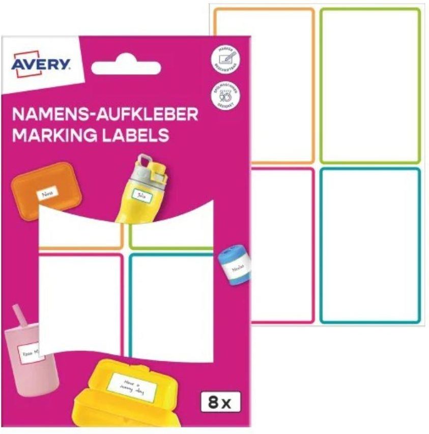 Naklejki do oznaczania AVERY, NAME8C- 2 arkusze - 8 etykiet - kolorowe - można po nich pisać markerem permanentnym, można myć w zmywarce, Folia Kod produktu: NAME8C Zawartość Etykiet: 8 / llość arkuszy: 2 8 kolorowych naklejek do oznaczania Przydatne do imiennego oznaczania pudełek na lunch, …