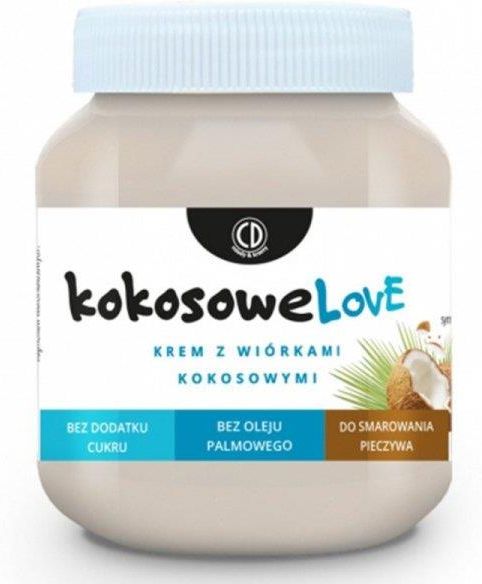 Krem z wiórkami kokosowymi bez dodatku cukru i oleju palmowego *Kokosowe Love* 320g – CD Krem bez dodatku cukru i bez oleju palmowego. Doskonała receptura i idealnie dobrane składniki tworzą niepowtarzalne kremy o szerokim zastosowaniu. Doskonale sprawdzają się jako krem na kanapkę, do naleśników, lodów, deserów oraz do bezpośredniego spożycia prosto ze słoika. Produkty oparte są na wysokiej klasy składnikach, nie zawierają zagęstników ani stabilizatorów. Składniki: substancje słodzące (maltitole), tłuszcze roślinne (shea, rzepakowy), mleko w proszku pełne, wiórki kokosowe 4,0 %, serwatka w proszku (z mleka), mleko w proszku odtłuszczone, aromaty, emulgator: lecytyny słonecznikowe. Wartość odżywcza w 100g - Wartość energetyczna 2210 kJ / 534 kcal** - Tłuszcz 42 g w tym kwasy tłuszczowe nasycone 15 g Węglowodany 51 g W tym cukry 8,3 g Białko 4,2 g Sól 0,21 g Alergeny: Mleko. Produkt może zawierać orzechy, soję, zboża zawierające gluten. Sposób przechowywania: Przechowywać w suchym, chłodnym i ciemnym miejscu. Producent: CD S.A, ul. Wapienicka 42, 43-382 Bielsko-Biała *RWS - Referencyjna wartość spożycia dla przeciętnej osoby dorosłej (8400KJ/2000kcal).