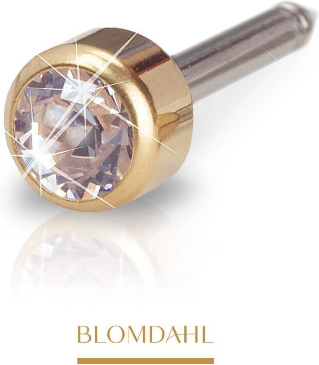 Blomdahl - Kolczyk Bezel Crystal 4mm 2szt Hipoalergiczny, sterylny kolczyk do przekłuwania uszu, wykonany z Czystego Tytanu Medycznego. Część ozdobna platerowana w kolorze złota. Kolczyk znajduje się w sterylnej kasecie. Część ozdobna: kryształ. Część ozdobna platerowana w kolorze złota. Średnica części ozdobnej: 4 mm.