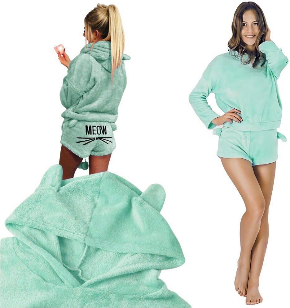 CIEPŁA PIŻAMA DAMSKA DWUCZĘŚCIOWA Z KAPTUREM MIĘKKA PLUSZOWA KRÓTKIE L Prochowice