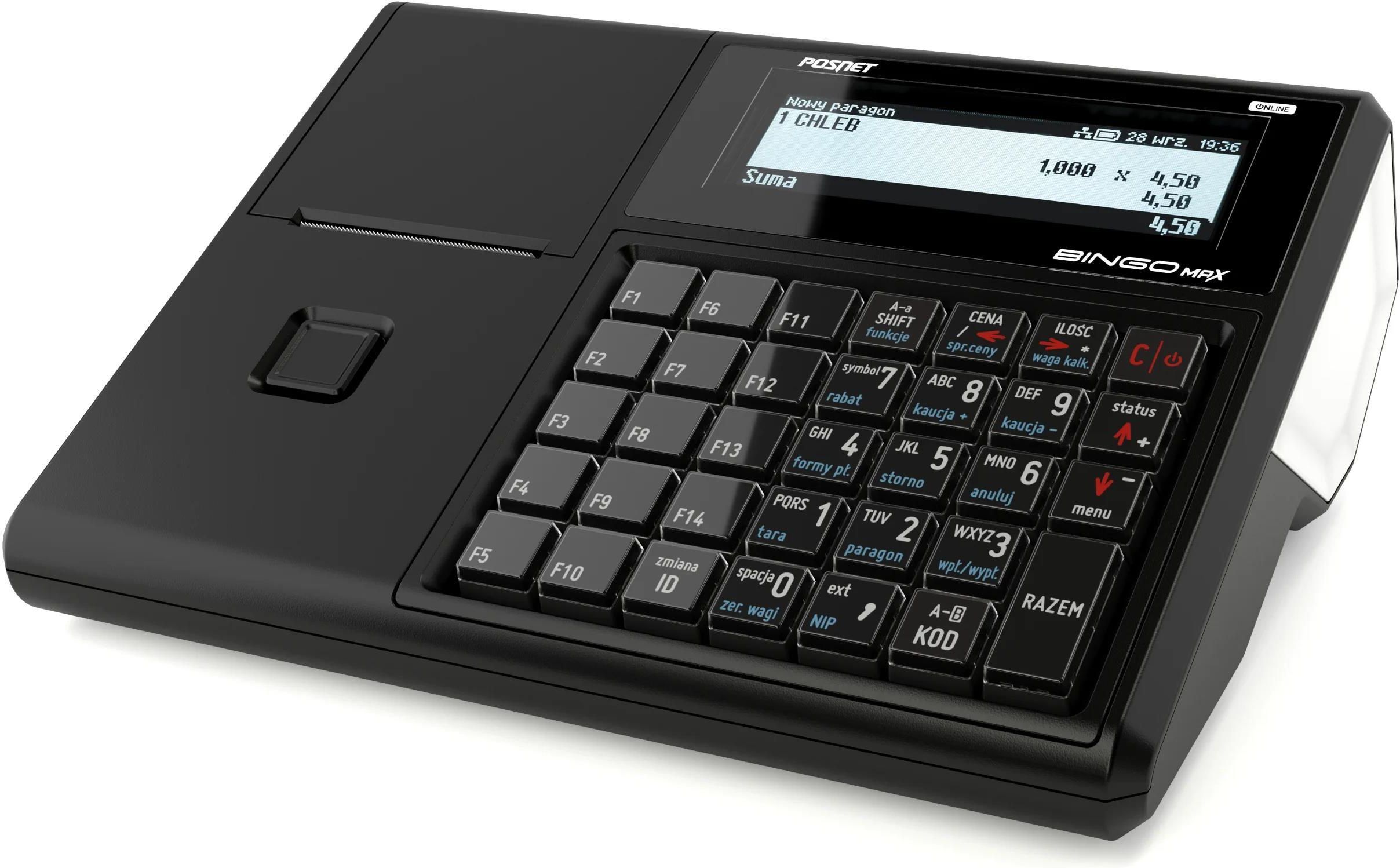Kasa Fiskalna Online Bingo Max2 USB, Ethernet Posnet Bingo Max2 Online to kasa fiskalna stworzona z myślą o nowoczesnych potrzebach rynkowych. Urządzenie łączy zaawansowane funkcje z kompaktową, ergonomicznie zaprojektowaną obudową. Zajmuje niewiele miejsca na ladzie, a jednocześnie daje ogromną swobodę w konfiguracji systemu sprzedaży. Jej wymiary (249 x 99 x 207 mm) i niska waga (ok. 1,4 kg) czynią ją niezwykle poręczną, nawet w punktach o ograniczonej przestrzeni.Kasa została zaprojektowana z myślą o szerokim gronie użytkowników: od małych sklepików osiedlowych, przez punkty usługowe, po gabinety lekarskie, salony fryzjerskie i kosmetyczne oraz lokalną gastronomię. Dużą zaletą jest możliwość pracy zarówno samodzielnie, jak i jako element większego systemu POS. To uniwersalne urządzenie dla każdego, kto ceni sobie wysoką jakość, nowoczesne rozwiązania i funkcjonalność. Umożliwia też łatwą rozbudowę infrastruktury sprzedażowej w miarę rozwoju firmy. Niezawodna komunikacja z CRK Zgodnie z wymogami Ministerstwa Finansów, Posnet Bingo Max2 Online wyposażona została w możliwość połączenia z Centralnym Repozytorium Kas. Producent umożliwił kilka opcji komunikacji, dzięki czemu urządzenie można z łatwością dostosować do możliwości technicznych danego miejsca: Ethernet (LAN) – stabilne połączenie przewodowe, USB – opcja podłączenia przez komputer z internetem, WiFi – bezprzewodowa łączność (moduł opcjonalny), Dzięki temu kasa może pracować praktycznie w każdych warunkach, a sprzedawca nie musi martwić się o zgodność z przepisami. Dodatkowo elastyczność w wyborze formy połączenia zapewnia niższe koszty wdrożenia oraz łatwiejsze zarządzanie infrastrukturą informatyczną. To istotna zaleta zwłaszcza dla punktów mobilnych, stoisk targowych czy małych przedsiębiorstw działających poza miastem. Rozwiązanie to daje też przewagę w przypadku nagłych zmian lokalizacji stanowisk sprzedażowych. Imponująca baza towarowa Bingo Max2 Online to kasa, która bez problemu poradzi sobie z rozbudowanym asortymentem. Standardowo pozwala na zapis 10 000 PLU, ale po rozszerzeniu może obsługiwać nawet do 60 000 nazw towarów lub usług. Długość nazw PLU wynosi do 40 znaków, co pozwala na czytelne i precyzyjne opisywanie produktów. Funkcja obsługi wielopaków i zestawów towarowych znacząco usprawnia sprzedaż sezonową lub promocyjną.Ponadto możliwe jest definiowanie: do 100 grup towarowych, 35 kasjerów, 35 form płatności, 6000 zestawów towarowych, 15 000 kodów kreskowych. Dzięki tak rozbudowanej strukturze baza danych kasy może być łatwo dostosowana do każdego rodzaju działalności. Nawet dynamicznie rozwijające się firmy nie będą musiały obawiać się o ograniczenia systemowe. To rozwiązanie, które rośnie razem z firmą. Funkcjonalności te pozwalają również na dokładne raportowanie i analizę sprzedaży, co jest pomocne przy podejmowaniu decyzji biznesowych. Wygoda pracy na co dzień Duży nacisk położono na intuicyjność obsługi. Bingo Max2 Online posiada mechaniczną klawiaturę z 42 klawiszami skrótów (3 poziomy po 14 klawiszy), które można dowolnie konfigurować. Szybki dostęp do najczęściej używanych funkcji skraca czas obsługi klienta, zwiększając efektywność pracy personelu.Kasa posiada dwa graficzne, podświetlane wyświetlacze – dla operatora oraz klienta. Zapewnia to komfort pracy w różnych warunkach oświetleniowych, a jednocześnie zwiększa przejrzystość transakcji dla klienta. Wyświetlacze te wspierają różne komunikaty marketingowe i promocyjne, co pozwala podnieść jakość obsługi.Mechanizm drukujący Seiko typu "drop-in" gwarantuje bezproblemową i szybką wymianę papieru (rolki 57 mm, do 60 metrów). Szybkość druku wynosi 16 linii na sekundę. Urządzenie obsługuje także druk paragonów z logo firmy oraz możliwością dodania NIP-u nabywcy, co jest istotne w relacjach B2B. To udogodnienie cenią sobie klienci biznesowi i stali kontrahenci. Całość sprawia, że codzienna obsługa klienta staje się bardziej profesjonalna i płynna. Integracja z urządzeniami zewnętrznymi Bingo Max2 Online może współpracować z: wagami elektronicznymi, czytnikami kodów kreskowych, terminalami płatniczymi (w tym BLIK), szufladami kasowymi, komputerami i systemami POS. Wyposażono ją w liczne złącza: 3 x RS232, 1 x USB (host), Ethernet. Opcjonalnie możliwe jest dołączenie modułu WiFi lub Bluetooth. Dzięki temu Bingo Max2 Online może działać jako część większego systemu sprzedażowego – od pojedynczego stanowiska, po zintegrowane środowisko sprzedaży wielostanowiskowej. Taka elastyczność sprzętowa czyni ją uniwersalnym wyborem dla każdego typu działalności handlowej. Integracja z innymi urządzeniami zwiększa automatyzację procesów i eliminuje błędy ludzkie. Nowoczesne funkcje i opcje Obsługa e-paragonów – wysyłka paragonów w formie elektronicznej, Funkcja kaso-wagi – integracja z wagami pozwalająca na automatyczne przekazywanie masy produktu do pozycji paragonu, Notatnik (do 1000 wpisów), Rabaty czasowe i stałe, zestawy, jednostki miary, Przypomnienie o przeglądach technicznych, Personalizacja paragonu (logo, NIP nabywcy), Eurofiskalizacja – możliwość pracy w walutach obcych. Te funkcje ułatwiają codzienną pracę, podnoszą jej jakość oraz wpływają na wizerunek firmy jako nowoczesnego i profesjonalnego punktu obsługi. Dodatkowo możliwość modyfikowania parametrów systemowych i baz danych czyni kasę narzędziem łatwym w adaptacji do zmieniających się realiów prawnych i gospodarczych. Funkcje dodatkowe zwiększają atrakcyjność urządzenia w oczach użytkowników końcowych. Bezpieczeństwo i zasilanie Kasa posiada pamięć chronioną (microSD/SDHC), akumulator awaryjny 6V/1,2 Ah oraz standardowe zasilanie 12V/2,5A. Pamięć chroniona zapewnia bezpieczeństwo danych na