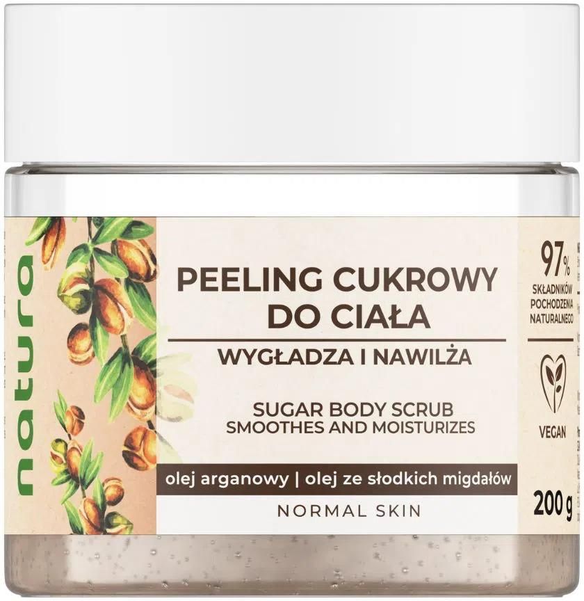 Natura peeling cukrowy do ciała z olejem arganowym i olejem ze słodkich migdałów – wygładza i nawilżaGruboziarnisty peeling do ciała z drobinkami cukru skutecznie usuwa zrogowaciały naskórek. Olej arganowy w połączeniu z olejem ze słodkich migdałów zmiękcza skórę, pozostawia ją gładką i przyjemną w dotyku. Przygotowuje naskórek do dalszych zabiegów pielęgnacyjnych.Stosowany regularnie chroni przed problemem wrastających włosków.Sposób użyciaNa zwilżoną skórę nanieść odpowiednią ilość peelingu. Masować okrężnymi ruchami, pozostawić na 2 minuty, a następnie spłukać ciepłą wodą. Doskonały również jako peeling do dłoni i stóp. Stosować 3-4 razy w tygodniu.
