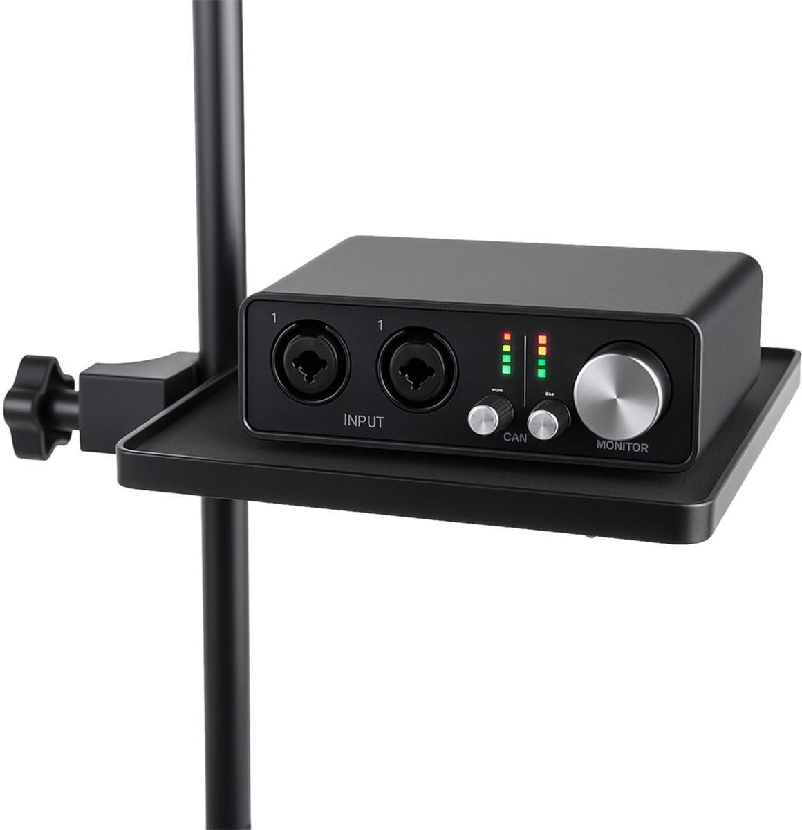 Mozos TNIA2 – kompaktowa półka montowana na statyw lub blat. Mozos TNIA2 to praktyczna i lekka półka zaprojektowana z myślą o szybkim dostępie do akcesoriów, narzędzi i drobnego sprzętu – idealna do zastosowań studyjnych, scenicznych, domowych i mobilnych. Dzięki wymiarom 245 x 185 mm oferuje wystarczająco dużo miejsca na mikrofony, interfejsy audio, efekty, zasilacze, słuchawki czy inne niezbędne drobiazgi. Wykonana z wytrzymałego tworzywa ABS+PC, półka jest odporna na uszkodzenia i stabilnie utrzymuje ciężar do 3 kg, co zapewnia bezpieczne użytkowanie nawet w dynamicznych warunkach pracy. Solidna i uniwersalna półka do statywu mikrofonowego. Regulowany zacisk umożliwia łatwy montaż do statywów, ram, blatów czy rur o grubości do 3,5 cm, gwarantując elastyczność instalacji w różnych przestrzeniach i konfiguracjach. Dzięki niewielkiej wadze (zaledwie 0,3 kg) TNIA2 jest niezwykle mobilna i szybka w rozstawieniu – świetna dla muzyków, realizatorów dźwięku i techników scenicznych. Tylko twoja wyobraźnia ogranicza zastosowanie półki do statywu mikrofonowego. Słuchawki? Interfejs audio? Dla Mozos TNIA2 to nie problem. W zestawie znajduje się półka Mozos TNIA2. Pozostałe elementy mają ukazać jedynie przykładowe zastosowanie.