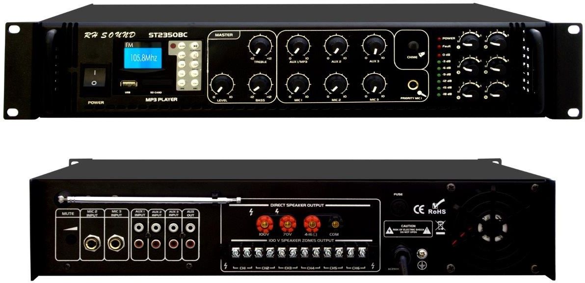 Wzmacniacz radiowęzłowy ST-2350BC/MP3+FM+IR Wzmacniacz radiowęzłowy uniwerslany znajdujący swoje zastosowanie jako zasilanie systemów nagłośnienia we wszystkich obiektach użyteczności publicznej, hotelach, restauracjach, urzędach, handlowych oraz sakralnych. Nowoczesna jednostka nagłośnieniowa z odtwarzaczem MP3 oraz tunerem FM. Duża moc wyjściowa oraz wyjście z podziałem na 6 niezależnych stref głośników pozwala na zasilanie systemów nagłaśniających duże powierzchnie. Wejścia: 3 x MIC (MIC z funkcją priorytetu), 3 x AUX, wbudowany odtwarzacz MP3 - dane z zewnętrznej pamięci USB lub karty SD. Wskaźnik poziomu sygnału wyjściowego MASTER VOLUME LED, wspólna korekcja tonów niskich i wysokich. Całość z mozliwością zdalnego sterowania. Dane techniczne: Moc wyjściowa: 350W (100V, 70V, 4-8-16 Ohm) 6 stref z indywidualną regulacją głośności Pasmo przenoszenia: od 50 Hz do 15 000 Hz zasilanie: 230V~/50Hz AC Wymiary: 480 x 88 x 390 mm Waga: 14 kg