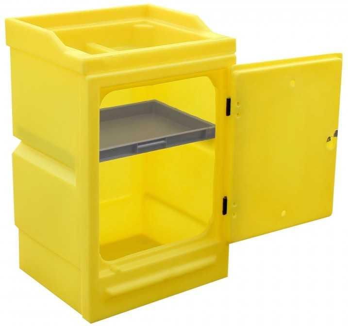 Bezpieczna szafka wykonana z wytrzymałego polietylenu. Solidna szafka z zamykanym drzwiczkami, wyposażona w półkę, która może służyć jako tymczasowa taca ociekowa. Idealna do zastosowania w laboratoriach lub na hali produkcyjnej jako „lokalny punkt magazynowy”. Otwarta szafka do przechowywania środków czyszczących, chemicznych, absorbentów. Pojemność półki górnej zewnętrznej: 18l; Pojemność półki: 8l; Pojemność całej szafki: 48l