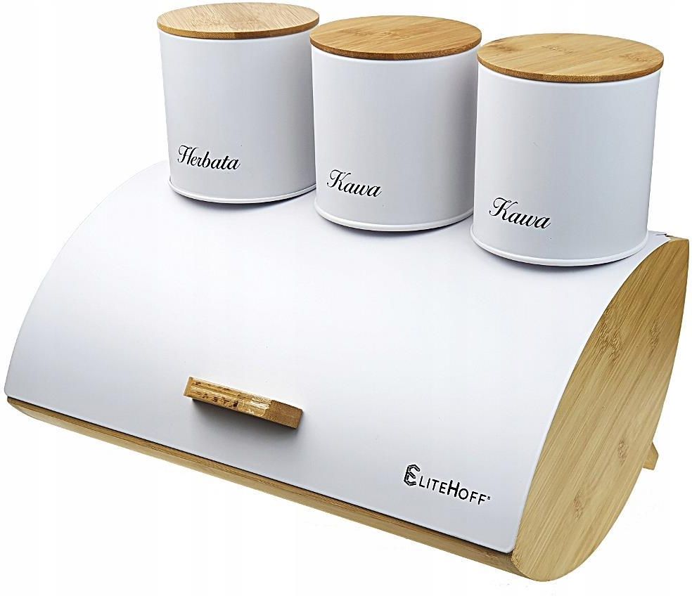 Chlebak Cosmic Biały + 3 Pojemniki  Chlebak wykonany z drewna bambusowego oraz metalu. Wyposażony w solidną pokrywkę wysuwaną do góry. Skuteczna ochrona przed wilgocią i wysychaniem pieczywa każdego rodzaju. Gwarancja świeżości przechowywanych produktów na długi czas. Produkt łatwy do utrzymania w czystości. Produkt bezpieczny w kontakcie żywnością. Nowoczesny design, który wpasuje się w zacisze każdej kuchni. Utrzymany w kolorze czarnym, przełamany drewnianą pokrywką. Dodatkowo, trzy pojemniki do przechowywania produktów sypkich: cukru, kawy i herbaty. Doskonale sprawdzą się jako dekoracja wnętrza. Wyróżnia się dużą pojemnością. Specyfikacja chlebaka: Kolor: Biały, brązowy Długość: 35 cm Szerokość: 25 cm Wysokość: 15 cm Zawartość zestawu: Chlebak z otwieraną pokrywą 35 cm 1 szt. Pojemniki do przechowywania 3 szt.