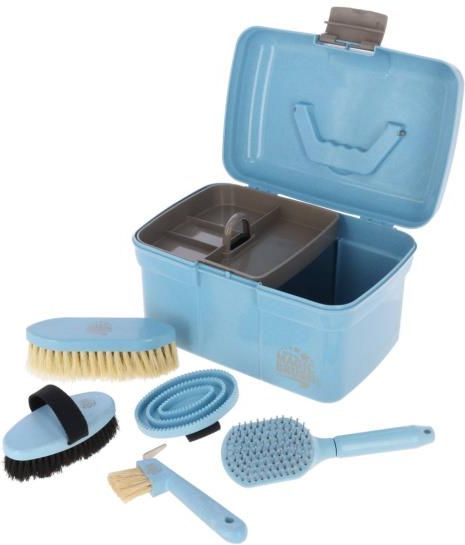 Skrzynka do przechowywania produktów pielęgnacyjnych, z wyjmowanym wkładem i uchwytem do przenoszenia. Zestaw zawiera: pojemnik na akcesoria, kopystkę do kopyt z naturalnym włosiem z włókien, zgrzebło, szczotka do grzywy z naturalnym włosiem z włókien, szczotka z końskim włosiem, szczotka do grzywy …