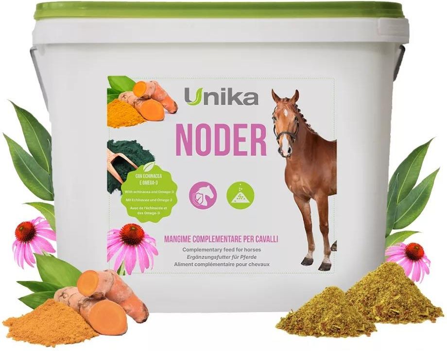 Noder to suplement opracowany w celu wspierania zdrowia skóry koni wrażliwych na ukąszenia owadów w okresie wiosenno-letnim. Zawiera Kurkumę, tawułę, jeżówkę i spirulinę – zioła lecznicze znane z korzystnego wpływu na zdrowie koni. Noder może być stosowany u koni cierpiących na nawracające letnie zapalenie skóry - jako wsparcie dla prawidłowych funkcji fizjologicznych skóry i układu odpornościowego. Według literatury naukowej kurkuma i tawuła pomagają redukować stany zapalne. Jeżówka i spirulina są znane ze swoich licznych dobroczynnych właściwości, szczególnie wspomagających układ odpornościowy. Sposób użycia Stosować 100 g dziennie od marca do września. W razie potrzeby zwiększyć dawkę do 200 g dziennie przez co najmniej 10–15 dni.