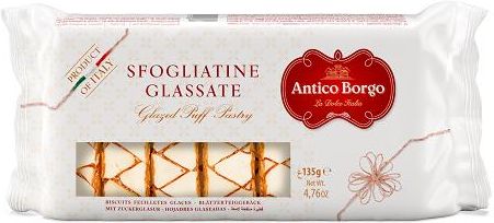 Kruche Ciasteczka z ciasta francuskiego z glazurą cukrową Antigo Borgo 135g Kruche ciastka Antico Borgo to słodkie ciasteczka z ciasta francuskiego, udekorowane cukrową glazurą. Są to ciastka sfogliatine, które składają się z kilku warstw delikatnego ciasta ze słodką polewą. Słodycz kruchych …
