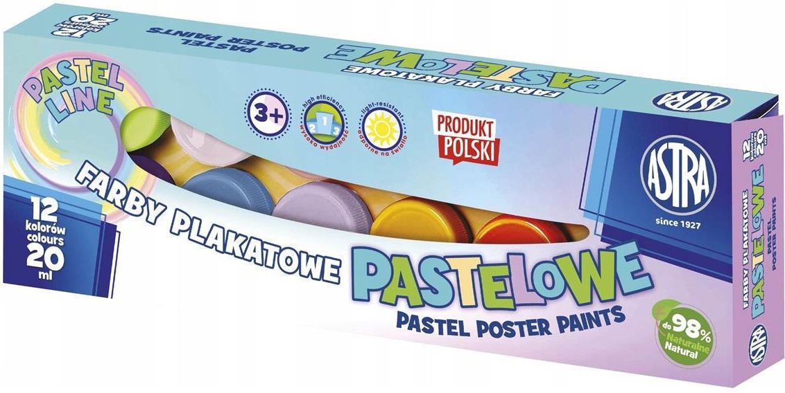 Farby plakatowe 12 kolorów pastelowe ASTRA Farby plakatowe pastelowe Astra z lini Pastel Line do malowania na papierze, kartonie, drewnie, nieglazurowanej ceramice i kamieniu. Wodorozcieńczalne farby kryjące są niezwykle wydajne i cechują się soczystymi i niezwykle intensywnymi pastelowymi barwami. Składają się w 98% z naturalnych składników i są odporne na działanie światła i ścieranie. Doskonale sprawdzą się na zajęciach z plastyki w przedszkolu oraz w szkole. Cechy produktu: bardzo wydajne, kryjące farby wodorozcieńczalne, czyste i intensywne barwy, do malowania na papierze, kartonie, drewnie, nieglazurowanej ceramice, kamieniu, odporne na działanie światła i ścieranie. Farby plakatowe są farbami wodnymi, kryjącymi o czystych i intensywnych barwach. Ze względu na znakomitą przyczepność, nadają się do malowania na takich podłożach jak: papier, karton, drewno, ceramika, kamień. Wymalowane powierzchnie po wyschnięciu są matowe o intensywnych barwach, odporne na działanie światła i ścieranie. Wysoką jakość farb uzyskujemy dzięki wysokiej jakości pigmentom i spoiwom użytym do produkcji tych farb, oraz technologii produkcji.