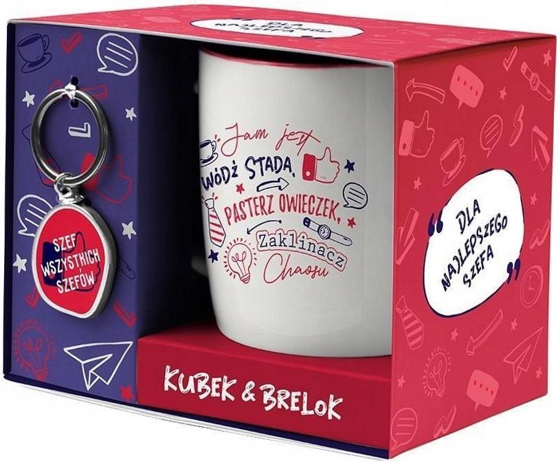 Zestaw prezentowy dla Najlepszego Szefa Rok wydania: - Rodzaj okładki: Twarda Autor: Stan: Nowa ISBN: 5900094241387 Wymiar: - Nr wydania: - Seria: - Ilość stron: - Waga: 0.5 kg Indeks: ate-668157 Idealny prezent dla Szefa lub współpracownika Zestaw prezentowy z dedykacją andquot;Najlepszego Szefaandquot; to doskonały wybór na awans, urodziny czy inną okazję. W skład zestawu wchodzi elegancki kubek i brelok, oba zapakowane w designerskie pudełko upominkowe. Kubek wykonany z ceramiki o pojemności 330 ml, z kolorowym designem i zabawnym napisem. Kubek można myć w zmywarce. Brelok o średnicy 45 mm wykonany z metalu to praktyczny dodatek do kluczy czy portfela. Specyfikacja: Kubek: ceramika, pojemność 330 ml, wysokość 8,5 cm, szerokość 8,5 cm, można myć w zmywarce. Brelok: metalowy, średnica 45 mm, kolor srebrny i czerwony. Praktyczny i elegancki prezent, który z pewnością zrobi wrażenie.