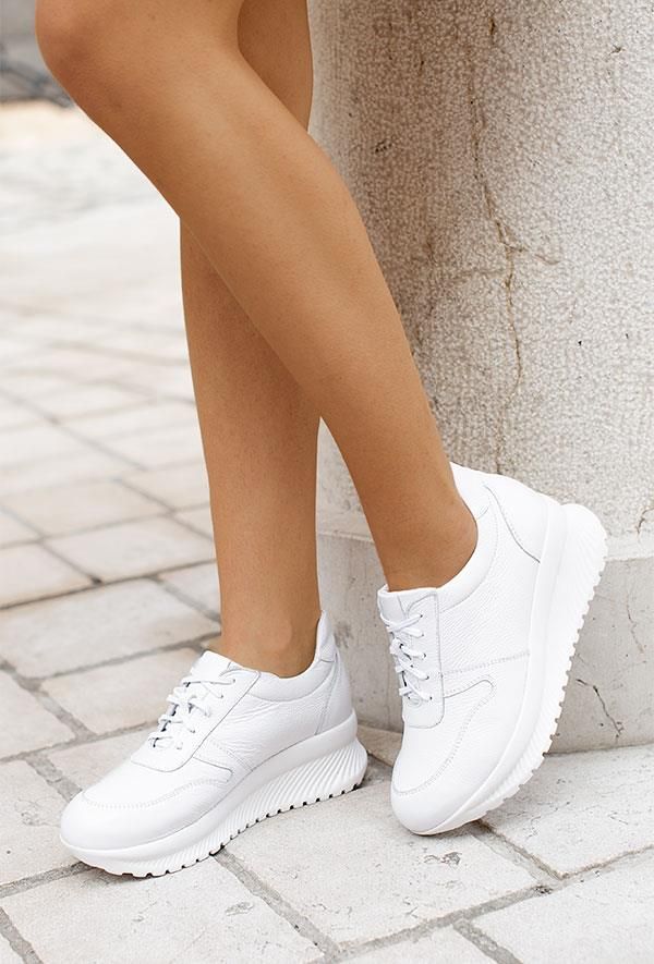 Sneakersy Merti w kolorze białym. Posiadają podeszwę z podwyższeniem z tyłu, która wysmukla nogi i nadaje butom elegancji. Sneakersy Merti wykonane w całości z naturalnej skóry włoskiej. Sznurowane. Klasyczne sneakersy Merti zostały ozdobione jedynie przeszyciami na cholewce, co dodatkowo dodaje im elegancji i klasy.