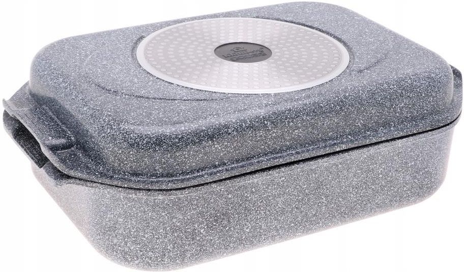Brytfanna marmurowa dwu funkcyjna Naczynie niezbędne w każdej kuchni, idealne do dań dla całej rodziny. Można w nim piec, gotować, smażyć i grillować Brytfanna ceramiczno-marmurowa to wysokiej jakości naczynie, które pełni funkcję garnka i patelni. Umożliwia przygotowywanie soczystych i kruchych potraw, które zachowują swoje witaminy i wartości odżywcze. Doskonale nadaje się do pieczenia mięsa, drobiu, warzyw, zapiekanek, potraw jednogarnkowych, a nawet ciast i chleba. Brytfanna z powłoką marmurową pozwala przyrządzać potrawy zdrowe i smaczne – można używać ją bez dużych ilości tłuszczu. Posiada specjalną marmurową i nieprzywierającąpowłokę, która zapobiega przypalaniu się jedzenia i dba o utrzymanie wartościowych składników w potrawie. Brytfanna ceramiczno-marmurowa wykonana jest z trwałego stopu aluminium z powłoką marmurową, równomiernie i szybkorozprowadzaciepło i jest prosta w czyszczeniu. Sprawdza się na wszystkich rodzajach kuchenek - halogenowych, ceramicznych, gazowych oraz indukcyjnych, ponadto może być stosowana w piekarniku. Zachwyca nie tylko wszechstronnąfunkcjonalnością, ale również swoim ekskluzywnym wyglądem. Marmurowa powłoka w modnych odcieniach, nowoczesny prostokątny kształt oraz dbałość o wszelkie detale sprawia, że brytfanna jest prawdziwą ozdobą każdego wnętrza kuchennego. Cechy produktu Wykonana z odlewanego aluminium dzięki czemu jest wytrzymała i lekka Zestaw składa się z brytfanny głębokiej oraz brytfanny/patelni grillowej Patelnia grillowa może również służyć jako przykrywka Przystosowana do gotowania i pieczenia niskotłuszczowego Brytfanka jest energooszczędna dzięki specjalnemu przewodnictwu termicznemu. Długo utrzymuje ciepło Pokryta powłoką marmurową, która zapobiega przywieraniu Łatwa w utrzymywaniu czystości, bezpieczna w zmywarkach Przystosowana do pieczenia w piekarnikach Brytfanka przystosowana do kuchenek gazowych, ceramicznych, elektrycznych i indukcyjnych; patelnia przystosowana do kuchenek gazowych i elektrycznych. Pojemność: 9 l Wymiar: 34 cm