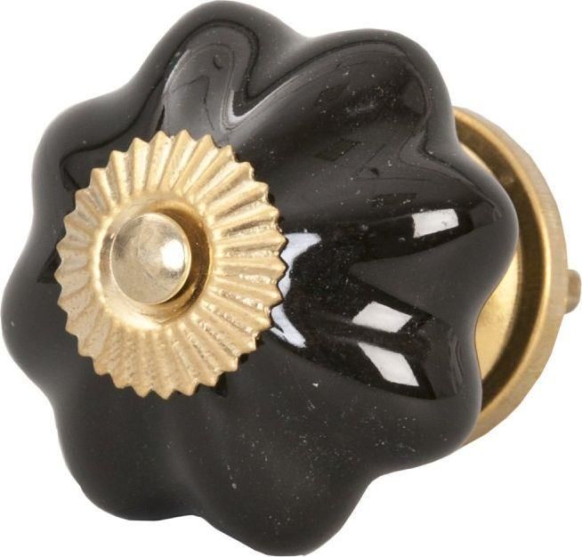 Gałka meblowa w kształcie kwiatu BLACK FLOWER, wykonana z ceramiki w kolorze czarnym z metalowymi dodatkami w kolorze mosiądzu. Wymiary: 4.5 x 4.2 cm.