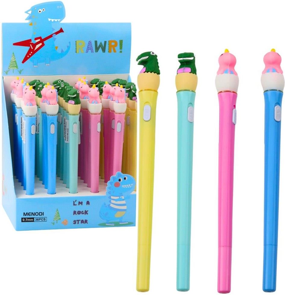 DŁUGOPIS ŚWIECĄCY DINOZAUR Z GUMKĄ, ZATYCZKĄ I ŚWIATEŁKIEM LED Długopis świecący z figurką dinozaura to idealny dodatek dla dzieci, które uwielbiają zabawne i kolorowe akcesoria szkolne. Wesoły design oraz świecący efekt LED sprawiają, że nauka i zabawa z tym długopisem stają się jeszcze ciekawsze. Górna część długopisu zakończona jest gumową figurką dinozaura, która pełni funkcję dekoracyjną i dodaje całości uroku. Dzięki zatyczce, końcówka pisząca jest dobrze chroniona przed wysychaniem, a wbudowany przycisk aktywuje efektowne światełko LED, które świeci przy każdym naciśnięciu. Długopis pisze cienką i precyzyjną linią o grubości 0,7 mm, co czyni go idealnym do codziennego notowania, rysowania czy dekorowania. Dzięki wymiarom 17,5 x 3 cm jest poręczny, lekki i łatwy do przechowywania w piórniku, tornistrze lub na biurku. To doskonały pomysł na prezent, nagrodę szkolną lub oryginalny gadżet, który uprzyjemni każdy dzień w szkole. W opakowaniu zbiorczym znajduje się 36szt. Sprzedawane osobno. Kolor wybierany losowo. SPECYFIKACJA Wymiary długopisu: 17,5 x 3 cm Wymiary opakowania zbiorczego: 18,5 x 18 x 15cm Grubość linii pisania: 0,7 mm Końcówka: Gumowa ozdobna w kształcie dinozaura (nie do ekranów) Zatyczka: Tak Podświetlenie LED: Tak, z włącznikiem Zasilanie: Bateria w zestawie Design: Dinozaur (mix kolorów) ZAWARTOŚĆ ZESTAWU 1x długopis świecący z dinozaurem, zatyczką i światełkiem LED Informacje o produkcie Certyfikat CE Ostrzeżenie! Nieodpowiednie dla dzieci w wieku poniżej 3 lat Płeć Uniseks Wiek +3 Długość towaru w centymetrach 2 Wysokość towaru w centymetrach 18 Szerokość towaru w centymetrach 2 Waga gabarytowa w gramach 12