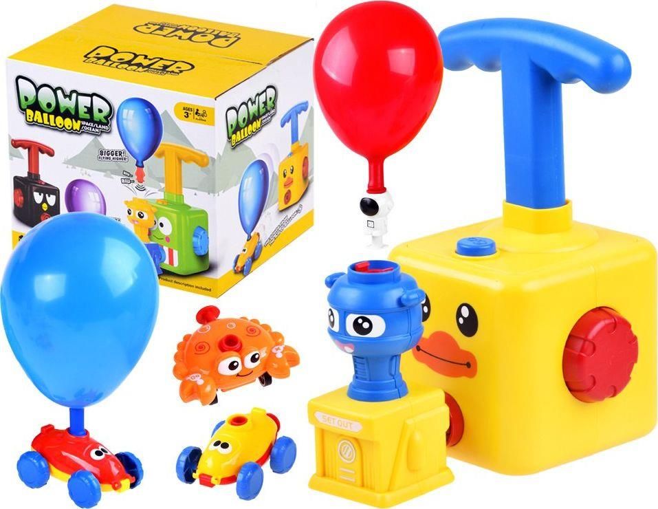 Balonowa wyrzutnia do zabawek z pompką świetnie się sprawdzi podczas zabawy. Zabawka aerodynamiczna zachęca do ruchu, do myślenia, obserwacji przyczyny i skutku. Zabawa wyrzutnią jest bardzo prosta, wystarczy zamontować tłok na kwadratowej kostce, zamocować balonik np. w autku i wykonać parę ruchów tłokiem. Balonik się napompuje i co za tym idzie: autko pojedzie, kosmonauta, rakieta poleci. Super pomysł na atrakcyjną zabawę. Zestaw zawiera: - urządzenie do pompowania balonów - duża wyrzutnia latających figurek - 2 samochody - krab - rakieta - kosmonauta - gwizdek - 12 balonów - 2 rurki Wymiary: - kostka z tłokiem 12 x 13 x 22 cm