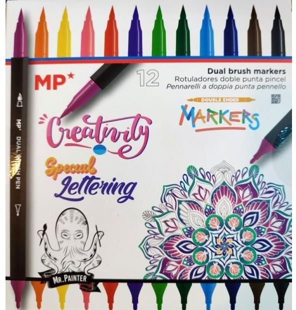 Dwustronne markery do kolorowania: jeden z pędzelkiemidealny do pisania, a drugi normalną końcówkądo kolorowania lub do wykańczania detali,ozdabiania, rękodzieła itp. Bardzo żywe kolory,które sprawią, że kreacje będą bardzo efektowne.Pudełko 12 kolorów. Wymiary: 210x173 mm Opakowanie: blister