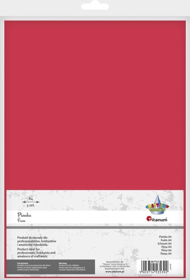 Pianka dekoracyjna czerwona A4 5 szt Titanum Pianka dekoracyjna format: A4 grubość około: 2 mm kolor: czerwona ilość: 5 ark Produkt doskonały dla amatorów, hobbystów i profesjonalistów rękodzieła
