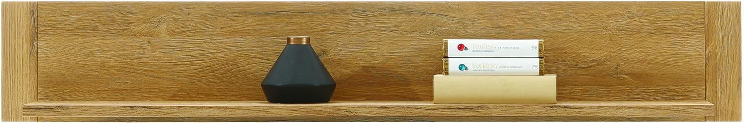 Półka wisząca YORK Y10 Półka ścienna YORK Y10 wzbogaca całą kolekcję o dodatkową przestrzeń do eksponowania pamiątek i zdjęć. Klasyczna forma w zestawieniu z nowoczesną kolorystyką bryły sprawia, że sama w sobie stanowi wysoki walor estetyczny i dekoracyjny. Konstrukcję wykonano z wysokiej jakości płyty wiórowej i MDF, zabezpieczonej trwałym obrzeżem ABS, które wyraźnie zwiększa jej odporność na uszkodzenia. Dane techniczne Mebel przeznaczony do samodzielnego montażu Półka YORK Y10 została wykonana z laminowanej płyty oraz w kolorze dębu grandson Wymiary -Szerokość: 149 cm -Głębokość: 23 cm -Wysokość: 24,5 cm Półka YORK Y10 została wykonana z płyty laminowanej, materiał ten powoduje że, mebel jest solidny, wytrzymały oraz odporny na zarysowania. Płyta została oklejona w kolorze dębu grandson do złudzenia przypominający prawdziwe drewno. Cechy Kolekcji York Korpus mebla wykonany z płyty laminowanej 16 mm/MDF 16mm, Blat korpusu wykonany jest z płyty laminowanej o grubości 22 mm, Fronty wykonane z płyty laminowanej o grubości 16 mm/ MDF 18mm, Korpus obrzeże ABS 0,5 mm. / 1,5 mm, Półki wewnętrzne wykonane z płyty laminowanej o grubości 16 mm, Półki wewnętrzne - obrzeża ABS 0.5 mm, Półka wisząca wykonana z płyty laminowanej o grubości 16 mm / 22 mm / MDF 18 mm, Półka wisząca - obrzeże ABS 0,5 mm / 1,5 mm, Kolorystyka brył : korpus - dąb grandson , fronty - dąb grandson / grafit, Blat ławy i stołu wykonany z płyty MDF o grubości 28 mm, Zawiasy 35 regulowane w trzech płaszczyznach, Stopki plastikowe bez regulacji, Uchwyty - podchwyt frezowany we froncie, Szuflady z prowadnicą kulkową (GTV) z pełnym wysuwem, Hartowane szkło szyb frontowych oraz bocznych, W opcji podświetlenie LED (barwa: biała ciepła).
