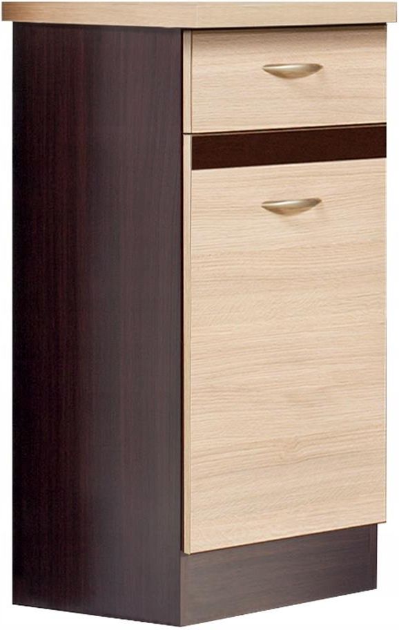 Szafka dolna ELIZA EZ11/D40S1 EZ11/D40S1 to stojąca jednodrzwiowa szafka kuchenna z jedną półką w środku oraz jedną szufladą. Mebel doskonale sprawdzi się w kuchni jako praktyczne miejsce służące do przechowywania sztućców oraz przyborów kuchennych. Korpus wykonano z wysokiej jakości płyty wiórowej …