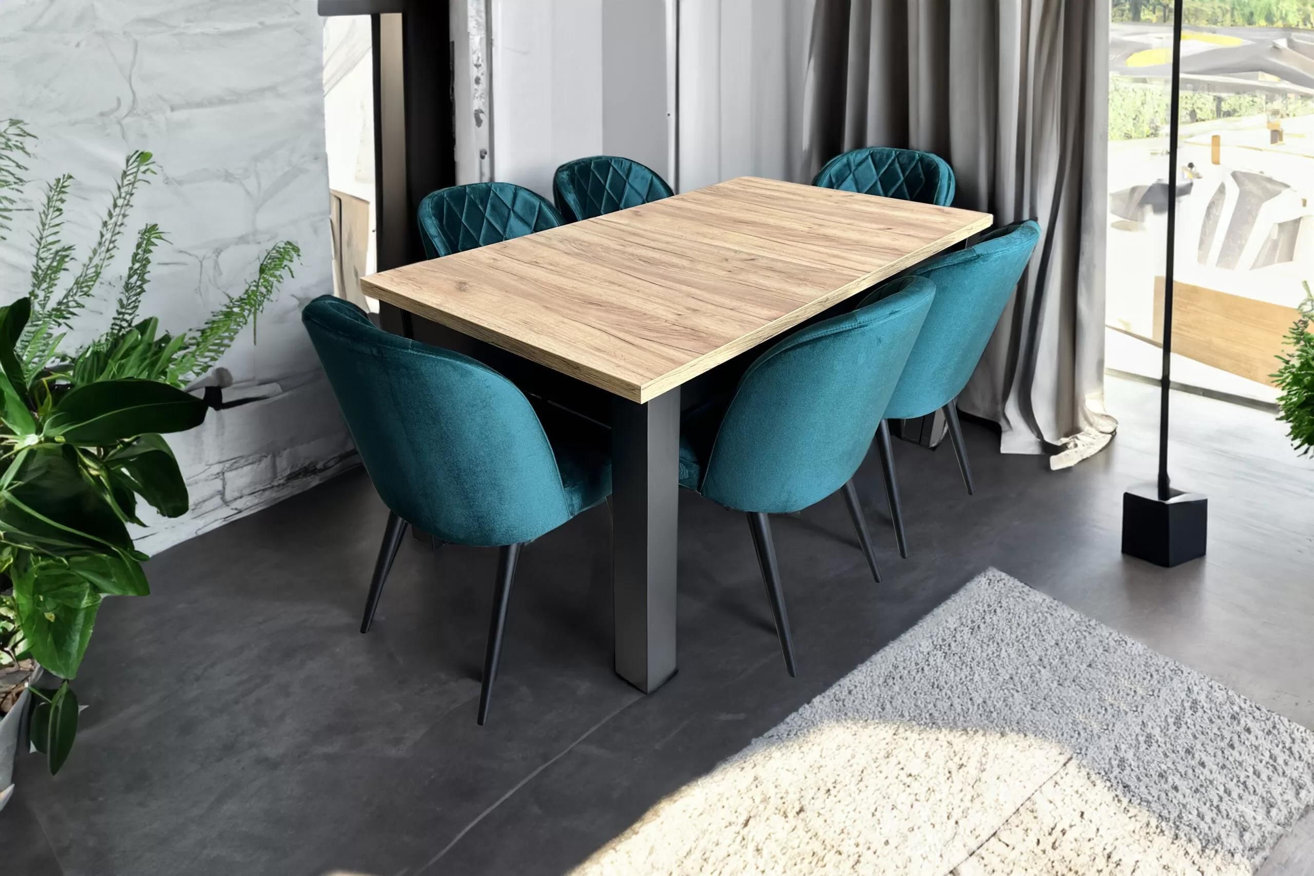 Zestaw mebli: DESIGNERSKI STÓŁ ROZKŁADANY FORTE 160/90 + 4X50 CM + 8 KRZESEŁ PEPITKA wymiar 160/90 4x 50 cm wkładka styl loft wybór koloru wybarwienia rama oraz nogi drewniane blat stołu laminowany nowoczesny model krzesła profilowane oparcie krzeseł polska produkcja możliwość materiału i koloru …