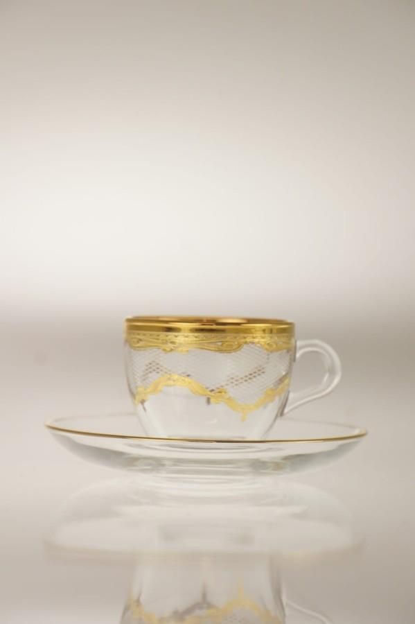 Dekoracja wykonana w naszym zakładzie w Opolu metodą trawienia w szkle.Malowane ręcznie 24 karatowym złotem.Filiżanka wykonana jest ze szkła hartowanego, które jest 2-3 razy bardziej odporne na uszkodzenia niż porcelitowe czy porcelanowe produkty o podobnej grubości. Komplet składa się z: 6 x Filiżanka6 x Spodek