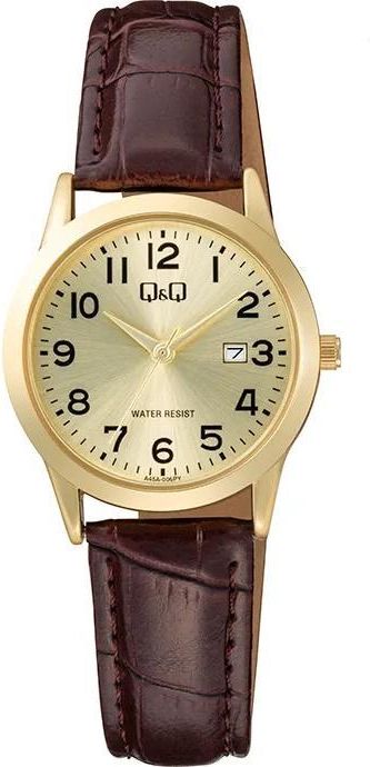 Damski klasyczny okrągły odporny na zachlapania zegarek Q&Q na brązowym skórzanym pasku. Złota czytelna tarcza z wyraźnymi cyframi i datownikiem. Koperta w kolorze złotym. Japoński mechanizm kwarcowy. Zegarek damski na prezent.