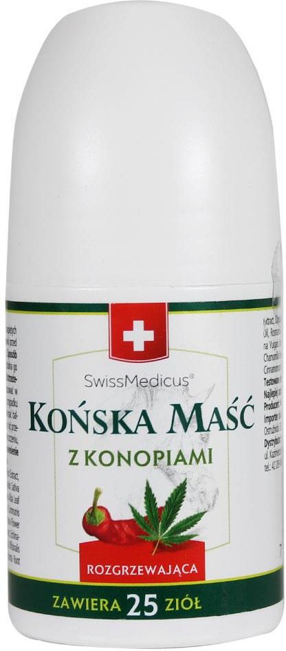 Roll-on Końska maść z konopiami rozgrzewająca 90 ml to innowacyjne, podręczne rozwiązanie. Teraz możesz mieć naszą maść zawsze pod ręką. Idealna na podróż czy do torebki. Końska maść z konopiami rozgrzewająca składa się z substancji o działaniu rozgrzewającym i regenerującym skórę. Można ją stosować w przypadku bólu stawów i mięśni. Z uwagi na silne działanie rozgrzewające, maść pobudza krążenie w tkankach, co pozwala na przyśpieszenie regeneracji po urazach. Ekstrakt z konopi, wchodzący w skład Końskiej maści rozgrzewającej z konopiami to dodatek wpływający na szybką regenerację stawów i dający im ulgę. Końską maść regeneracyjną z konopiami warto zastosować ze względu na bardzo szybkie działanie – olejki eteryczne wchodzące w skład tego balsamu, natychmiast usuwają ból i przywracają prawidłowe funkcjonowanie stawów i mięśni. Pozostałe składniki mają długotrwałe działanie regenerujące, dlatego zapobiegają powstawaniu kolejnych dolegliwości. Końska maść rozgrzewająca z konopiami to bezpieczny preparat, który zawiera dokładnie przebadane i przetestowane składniki aktywne.