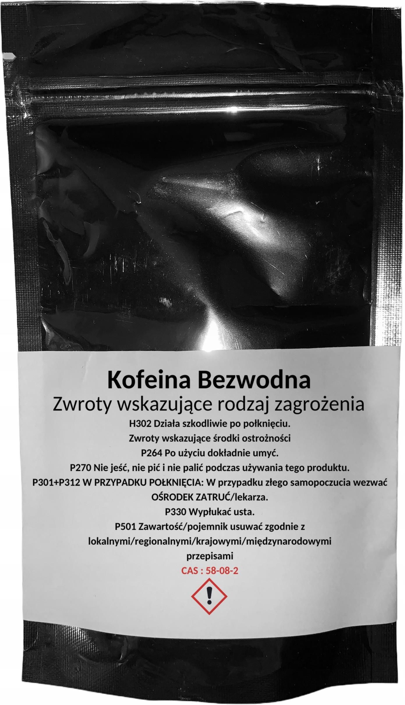 Bezwodna kofeina Coffeinum 500g BIOLABORATORIUM Informacje techniczne dotyczące odczynników chemicznych: Wzór chemiczny: C₈H₁₀N₄O₂ Numer CAS: 58-08-2 Numer WE: 200-362-1 Synonimy: Kofeina, Coffeinum Masa netto: 100g Przykłady profesjonalnych zastosowań w różnych branżach: Przemysł farmaceutyczny: Produkcja leków: Bezwodna kofeina jest stosowana w przemyśle farmaceutycznym do produkcji leków. Znajduje zastosowanie w środkach przeciwbólowych, lekach na przeziębienie oraz w leczeniu zmęczenia i zaburzeń snu. Kofeina działa stymulująco na ośrodkowy układ nerwowy i pomaga zwiększyć czujność. Przemysł spożywczy i napojów: Napoje energetyczne i produkty pobudzające: W przemyśle spożywczym i napojów bezwodna kofeina jest wykorzystywana do produkcji napojów energetycznych, batonów energetycznych i innych produktów zawierających kofeinę. Zwiększa poziom energii i poprawia wydolność organizmu. Odżywki sportowe: Suplementy dla sportowców: Bezwodna kofeina jest składnikiem stosowanym w suplementach diety dla sportowców, w tym w produktach przedtreningowych, batonach energetycznych oraz suplementach wspomagających wytrzymałość i koncentrację. Przemysł kosmetyczny: Produkty do pielęgnacji skóry: Bezwodna kofeina znajduje zastosowanie w kosmetykach, takich jak kremy przeciwstarzeniowe, kremy pod oczy oraz preparaty antycellulitowe. Pomaga zmniejszyć opuchliznę, ujędrnia skórę i redukuje widoczność cellulitu. Badania i rozwój: Badania biomedyczne: Bezwodna kofeina jest stosowana w badaniach biomedycznych w celu analizy wpływu kofeiny na organizm człowieka. Służy jako substancja modelowa w badaniach nad działaniem stymulantów i opracowywaniem nowych terapii. Weterynaria: Leki dla zwierząt: W weterynarii bezwodna kofeina jest wykorzystywana do produkcji leków dla zwierząt. Pomaga zwalczać zmęczenie i zwiększa czujność zwierząt, zwłaszcza w sytuacjach wymagających wzmożonej uwagi. Produkty wspomagające dietę i odchudzanie: Środki hamujące apetyt i pobudzające metabolizm: Bezwodna kofeina jest stosowana w produktach odchudzających jako środek hamujący apetyt i pobudzający metabolizm. Pomaga zwiększyć wydatek energetyczny i kontrolować apetyt. Zagrożenia H302: Działa szkodliwie po połknięciu. P264: Po użyciu dokładnie umyć ręce. P270: Nie jeść, nie pić ani nie palić podczas stosowania tego produktu. P301 + P312 + P330: W PRZYPADKU POŁKNIĘCIA: W razie złego samopoczucia skontaktować się z OŚRODKIEM ZATRUĆ lub lekarzem. Przepłukać usta. P501: Zawartość/pojemnik usuwać do autoryzowanego zakładu utylizacji odpadów. Rekomendowane warunki przechowywania: Zaleca się przechowywanie bezwodnej kofeiny w suchym i dobrze wentylowanym miejscu. Produkt należy chronić przed bezpośrednim działaniem promieni słonecznych. Przechowywać w szczelnie zamkniętym pojemniku, aby zapobiec dostępowi wilgoci. Trzymać z dala od łatwopalnych substancji i materiałów o silnym zapachu. Przechowywać poza zasięgiem dzieci i zwierząt. Opakowanie powinno zawierać odpowiednie oznakowanie oraz etykiety ostrzegawcze dotyczące ryzyka i zasad postępowania w przypadku ekspozycji.