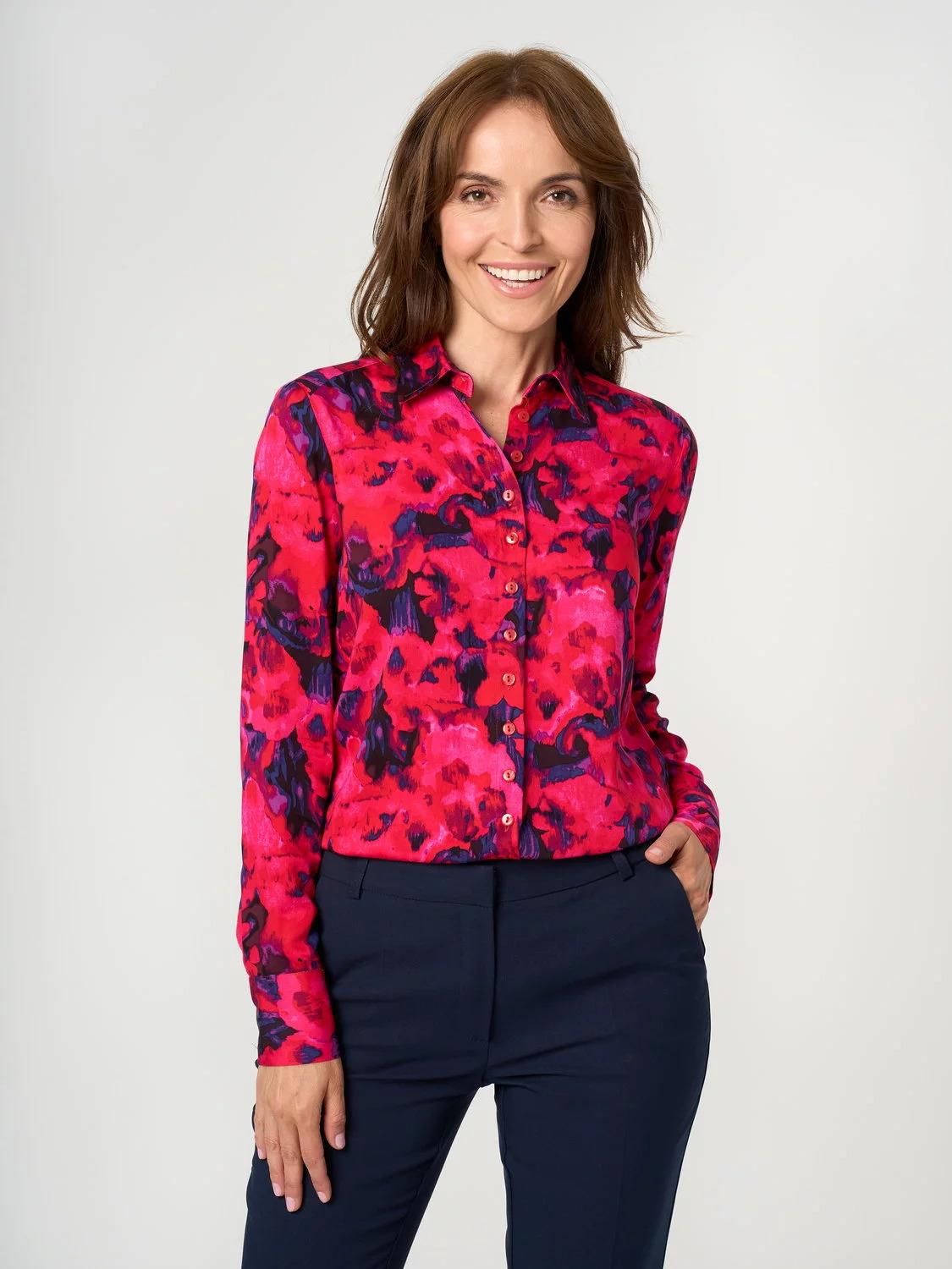 Czerwona koszula damska o prostym kroju w granatowe maziaje, klasyczny, miękki kołnierzyk, 100% wiskoza