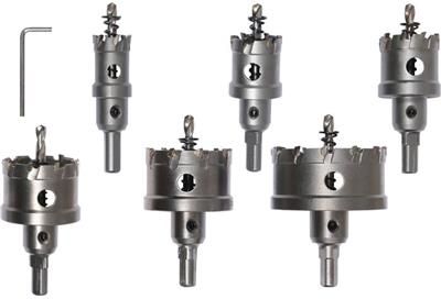 Otwornice TCT do metalu 22 30 35 45 50 65 mm 6sztZestaw otwornic przeznaczony do wycinania otworów w stali konstrukcyjnej (teowniki HEA, HEB, rozdzielnice elektryczne, skrzynki gazowe), w stali nierdzewnej, tworzywach sztucznych (ABS, PE, PCV, również zbrojonych włóknem szklanym). Sprężyna wypychająca ułatwia usunięcie wyciętego elementu z kielicha. materiał: węglik spiekany YG10X materiał pilota: HSS4341 TIN materiał korpusu: stal węglowa rodzaj uchwytu narzędziowego: sześciokątny rozmiar uchwytu narzędziowego:1/4" (6.3 mm) i 3/8" (10.0 mm) głębokość cięcia: 25 mm w zestawie średnice otwornic: 22, 30, 35, 45, 50, 65 mmWykończenie wiertła pokryte azotkiem tytanu Głębokość cięcia 25 mm Zastosowanie cd. tworzywach sztucznych (ABS, PE, PCV, również zbrojonych włóknem szklanym) Długość całkowita 103 mm Liczba sztuk w zestawie 6 Rodzaj uchwytu narzędziowego sześciokątny Zastosowanie wycinanie otworów w stal konstrukcyjnej (teowniki HEA, HEB, rozdzielnice elektryczne, skrzynki gazowe), stali nierdzewnej, Materiał stal węglowa|YG10X Materiał wiertła HSS 4341 Rozmiar uchwytu narzędziowego 1/4" (6.3 mm)|3/8" (10.0 mm) Średnica 22|30|35|45|50|65 mm