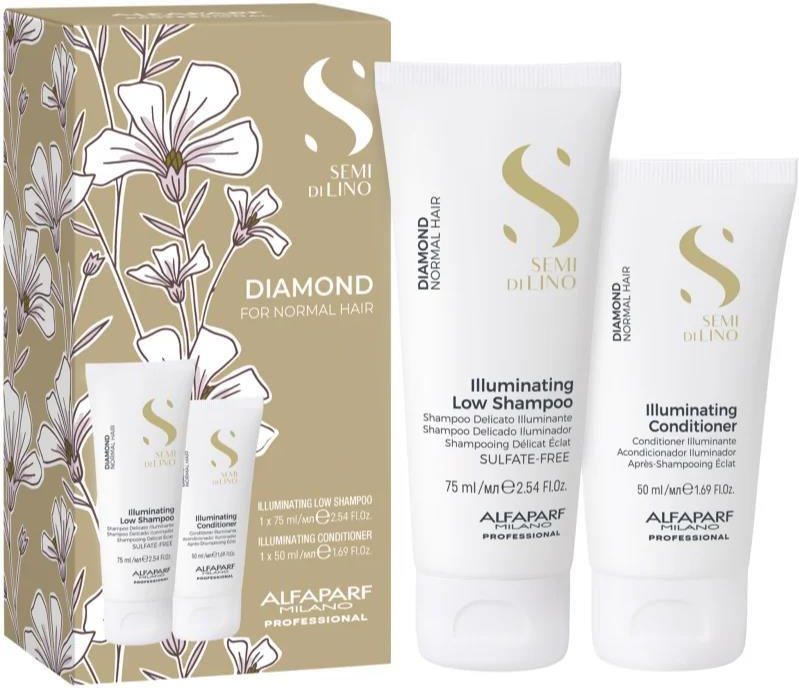 Alfaparf Milano Semi di Lino Diamond Minisize Kit, 2 szt., Zestawy kosmetyków dla kobiet, Zawartość zestawu: Alfaparf Milano Semi di Lino Diamond Illuminating szampon rozświetlający do włosów normalnych 75 ml Alfaparf Milano Semi di Lino Diamond Illuminating odżywka do włosów nadająca połysk i ułatwiająca rozczesywanie 50 ml Właściwości: nadaje włosom olśniewający blask zapewnia potrzebne nawilżenie myje włosy i oczyszcza skórę głowy