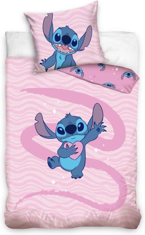 Kolorowy komplet pościeli z motywem Stitcha, obejmujący poszwę na kołdrę i poszewkę na poduszkę. Pościel bawełniana w rozmiarze 140x200 cm+70x90 cm Materiał: 100% bawełna. Wzór dwustronny Kolor: różowy