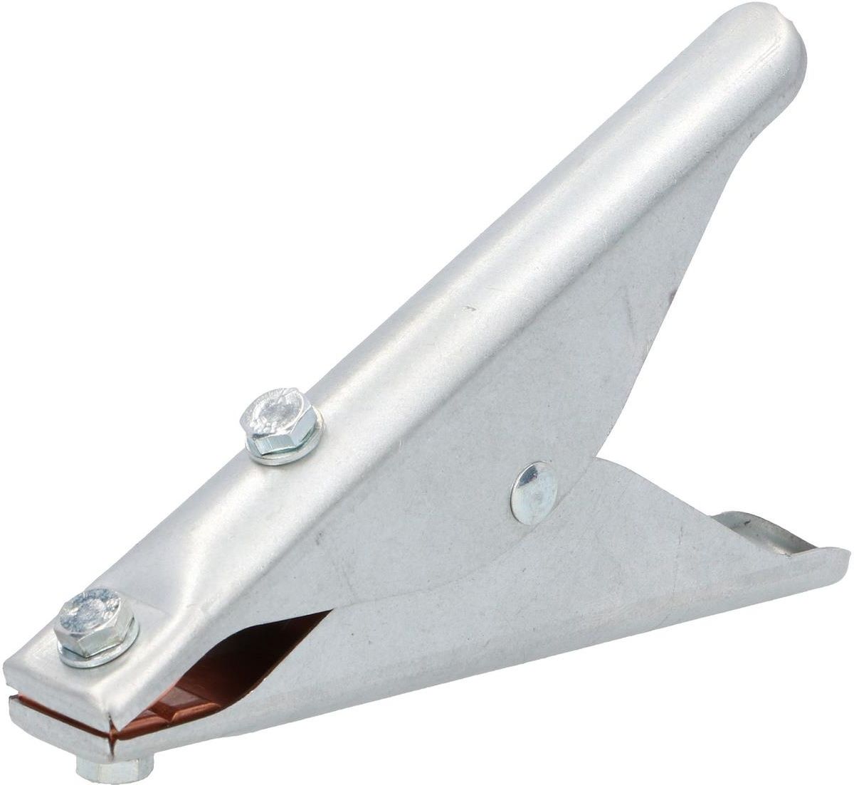 Zacisk biegunowy, kleszczowy dzięki silnej sprężynie pozwala na szybkie i pewne mocowanie masowego przewodu spawalniczego. Miedziane nakładki szczęk poprawiają przewodzenie prądu w czasie spawania.