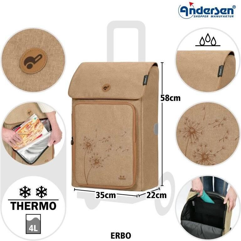 Torba na stelaż wózka zakupowego ANDERSEN Erbo Stan: Nowy Kolory: Beżowy Materiał: Poliester Waga (kg): 1,0 Wymiary wys/szer/głęb (cm): 58 x 35 x 22 Pojemność (l): 45 Budowa wytrzymała, wodoodporna torba zamykana na suwak- łatwa w zdejmowaniu i czyszczeniu na zewnątrz znajduje się kieszeń termiczna o pojemności 4 litrów, zamykana na suwak wewnątrz mała kieszeń Czas realizacji od 10 do 14 dni