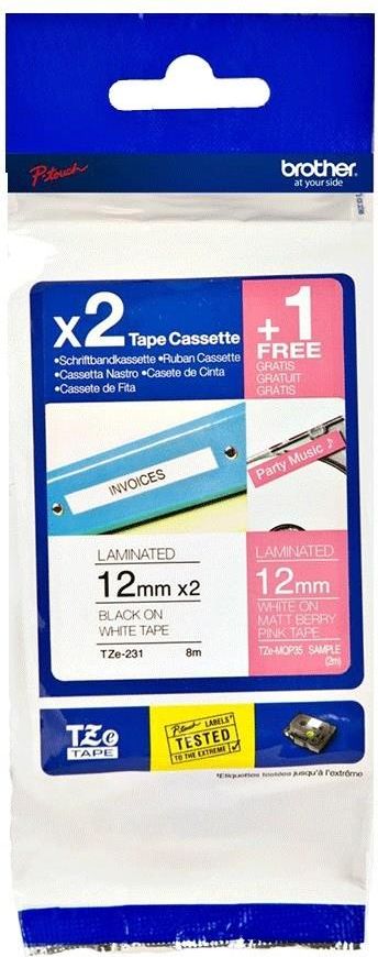 Wielopak TZE-32M3 oryginalnych taśm firmy Brother - 2 x czarny nadruk na białym tle (12mm), 1 x biały nadruk na różowym matowym tle (12mm) Pakiet laminowanych taśm TZe-32M3 firmy Brother kompatybilnych z drukarkami P-touch. Wszechstronny i czytelny, dzięki kontrastującym kolorom czcionki i tła. Stanowi przydatne narządzenie do znakowania zarówno w domu, w biurze, jak i w innych miejscach.  Główne cechy 2 taśmy x 12mm szerokości, 8m długości (czarny nadruk na białym tle), 1 x 2m długości (biały nadruk na matowym różowym tle) Wysokiej jakości oryginalna taśma firmy Brother Zapewnia wyraźne i trwałe rezultaty Pakiet oryginalnych taśm TZe-32M3 firmy Brother. W skład wielopaku wchodzą: 2 taśmy z czarnym nadrukiem na białym tle oraz 1 taśma z białym nadrukiem na różowym matowym tle. Taśmy gwarantują wyraźne, trwałe i czytelne etykiety.   Taśmy sprawdzą się zarówno w domu, biurze jak i w innym miejscu pracy. Etykiety mają wszechstronne zastosowanie - od identyfikacji akt osobowych i szafek, przez pamięć USB aż po inne aktywa.   Samoprzylepne etykiety są wytrzymałe temperaturowo, odporne na chemikalia, wodę, ścieranie. Mogą być zatem stosowane zarówno wewnątrz jak i na zewnątrz.   Taśmy TZe są łatwe i szybkie w montażu. Występują w wielu kolorach i rozmiarach, a także materiałach. Taśmy TZe z pewnością sprostają Twoim oczekiwaniom w zakresie etykiet.