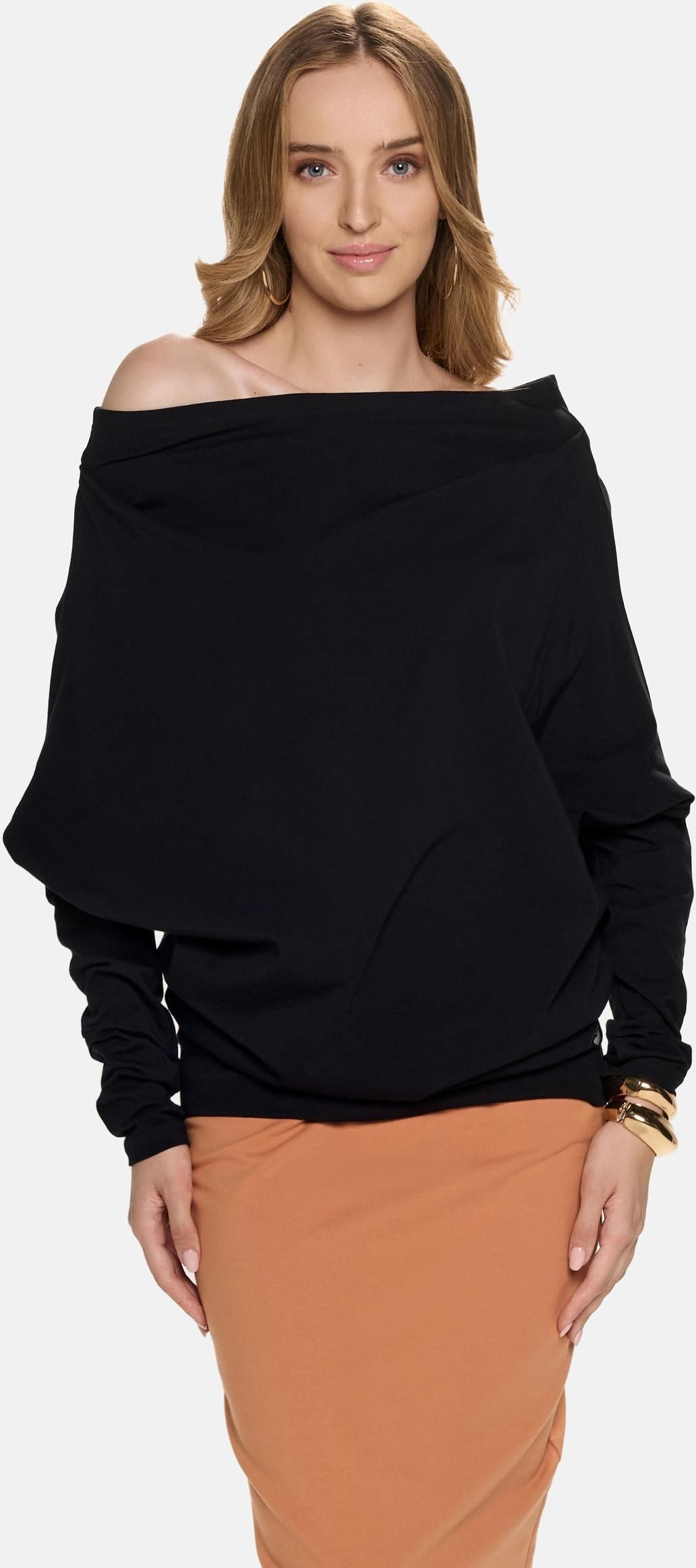 KOLOR: CZARNY Bawełna 94%, elastan 6%. Elastyczna dzianina bawełniana. GRAMATURA: 190 G/M2 Bluzka o charakterystycznym szerokim dekolcie, lekko opadającym z ramion. Długie rękawy są luźne na górze, ale zwężane od łokcia w dół. Na biodrach bluzka jest dopasowana szerokim ściągaczem przeszytym z …