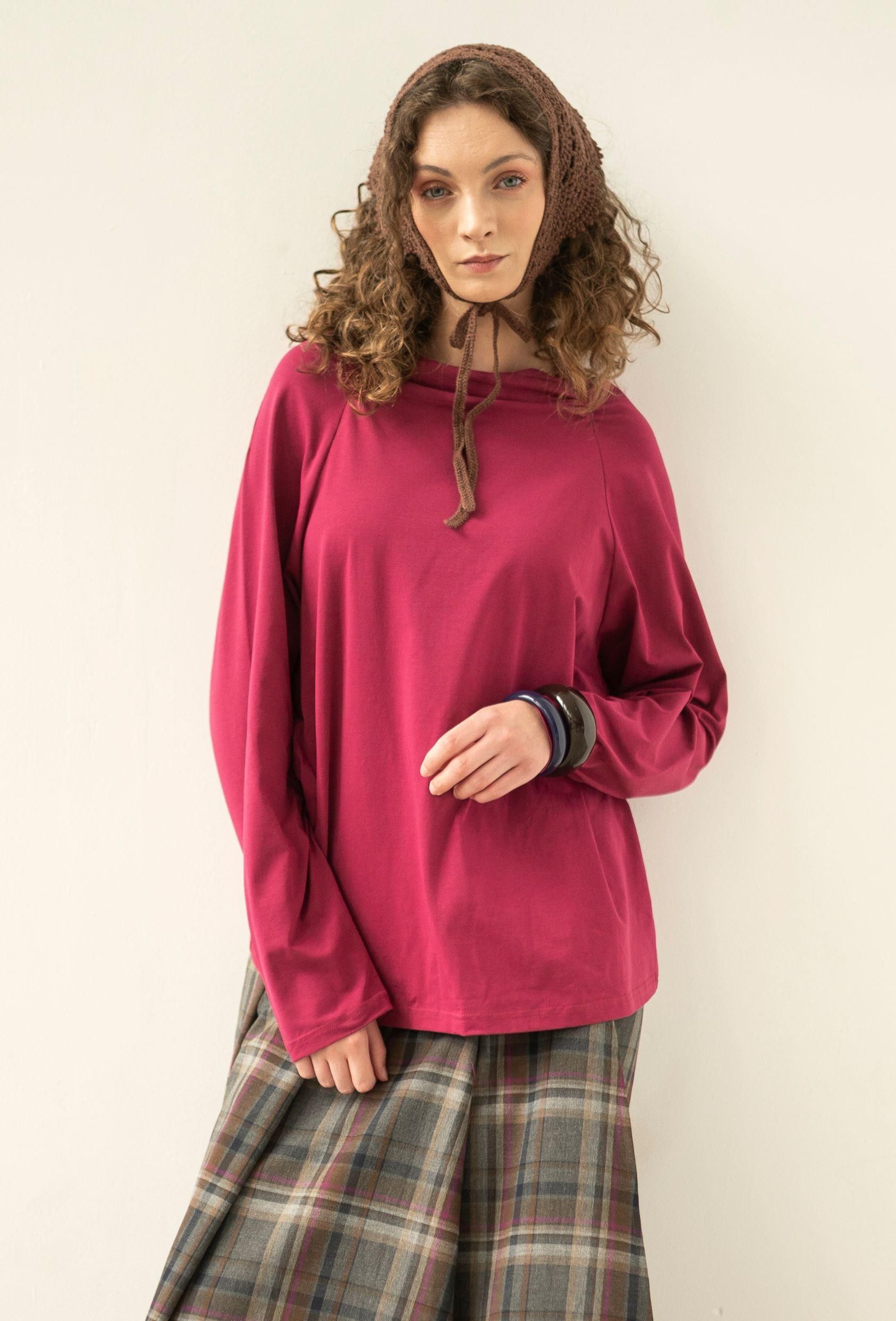 KOLOR: WIŚNIOWY Bawełna 94%, elastan 6%. Elastyczna dzianina bawełniana. GRAMATURA: 150 G/M2 Bluzka z długim rękawem, która została urozmaicona subtelnym marszczeniem przy dekolcie. Zaprojektowana i uszyta w Polsce. • subtelne marszczenie przy dekolcie, • długi rękaw, • prosty, lekko luźny fason, • modelka ma 177 cm wzrostu i nosi rozmiar M. Wymiary/