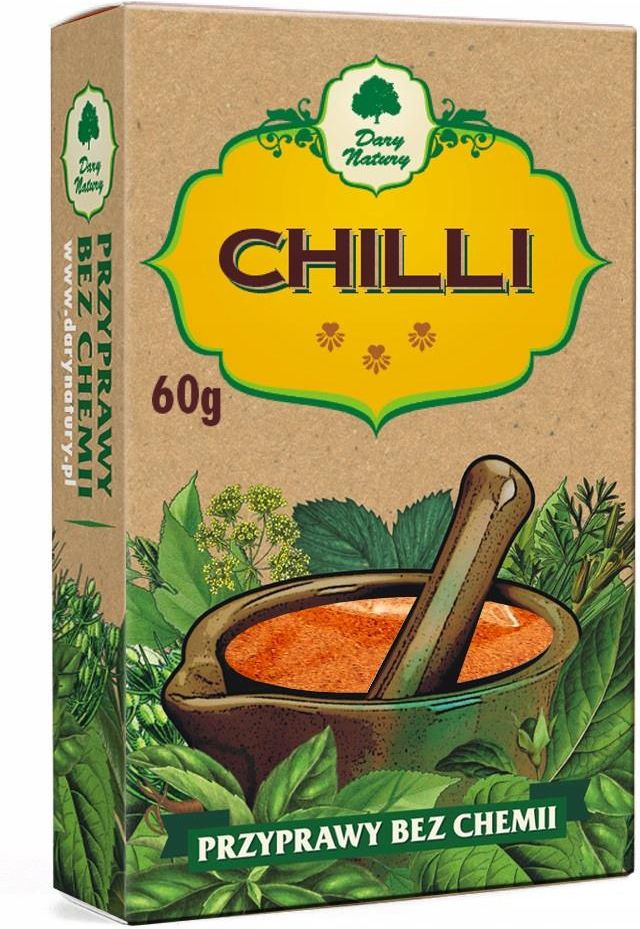 Chilli DARY NATURY60 gChili nadaje przyprawom pikantny i ostry smak. Dodaje się go w niewielkiej ilości, według indywidualnych upodobań do gulaszu, mięsa, ryb, potraw jarzynowych i sosów. Chilli ma również doskonały wpływ na trawienie.Składniki: chilli 100%