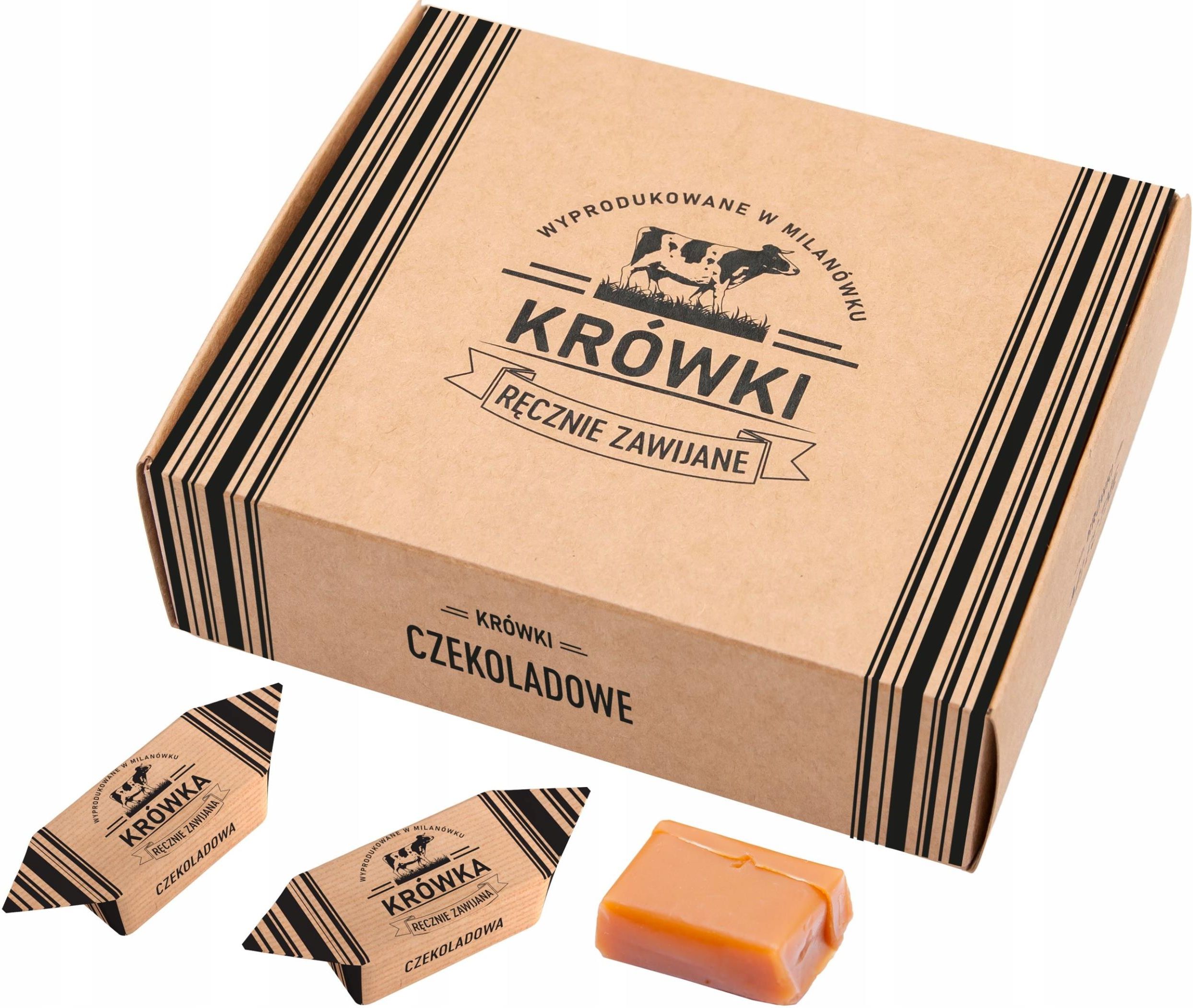Krówki w pudełku, na każdą okazję! Tradycyjne krówki ciągutki, ręcznie pakowane staropolskie receptury smak: czekoladowe etykiety wykonane z kraftowego papieru z nadrukiem producenta B&B Słodycze z Pomysłem! zapakowane w kartonowe pudełeczko wyprodukowane w Milanówku cukierek dodatkowo …