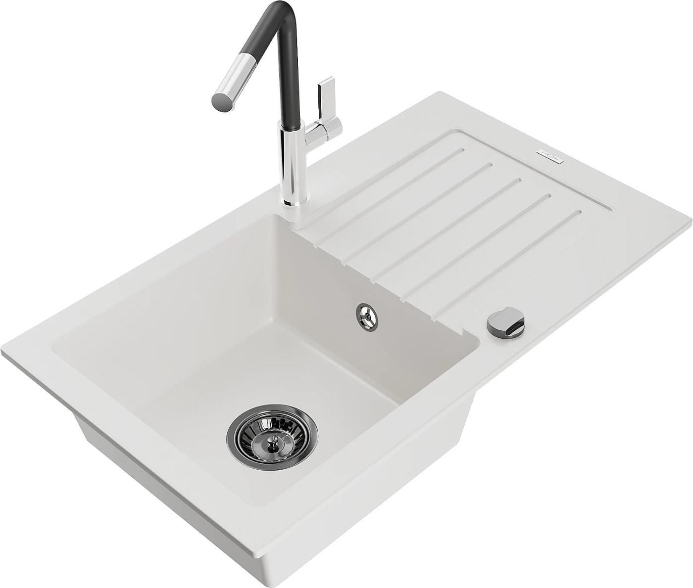 Mexen Pablo zlewozmywak granitowy 1-komorowy z ociekaczem i baterią kuchenną Flora, biały - 6510-20-670401-07-B Dane produktu Producent: Mexen Nr katalogowy: 6510-20-670401-07-B Kod EAN: 5905315059499 Cechy produktu Seria: Pablo Dłuższy bok: 752 mm Krótszy bok: 436 mm Typ: Wpuszczany Kształt: Prostokątny Wyciągana wylewka: Nie Wysokość baterii: 30,7 cm Zasięg wylewki: 24,5 cm Możliwość podłączenia filtra wody: Nie Ilość komór: 1-komorowy Otwory: 2 Podcięcia pod otwory: 2 Ociekacz: Długi ociekacz Syfon automatyczny: Tak Przelew: Tak Kolor syfonu: Czarny Kolor zlewu: Biały Kolor baterii: Czarny/Chrom Dane techniczne: Zlewozmywak: Rozmiar: 752x436x161 mm Głębokość komory: 151 mm Wymiary komory: 356x332 mm Średnica odpływu: ø90 mm Typ: 1-komorowy z ociekaczem Rodzaj: Wpuszczany w blat Kolor: Biały Wykończenie syfonu: Czarny Materiał: Granit (80% kruszywo granitowe 20% żywice) Otwór przelewowy: Tak Otwory: ( bateria, automat ) 2 Montaż: Uniwersalny, możliwość montażu z ociekaczem po lewej lub prawej stronie Wysoka odporność na zarysowania i przebarwienia Odporność na szok termiczny Powierzchnia ułatwiająca czyszczenie Dwa dodatkowe podfrezowane otwory do samodzielnego wybicia ø35 Bateria kuchenna: Materiał: Mosiądz Kolor: Chrom/Czarny Głowica: Ceramiczna Perlator: Tak Typ: Jednouchwytowa Zasięg wylewki: 245 mm Wysokość baterii: 307 mm Jeśli dla Ciebie, tak samo jak i dla nas, wyposażenie łazienki i toalety ma być nie tylko funkcjonalne i ułatwiające życie, ale także ma stanowić ich ozdobę – koniecznie sprawdź naszą ofertę. Jeśli zgadzasz się ze stwierdzeniem, że elegancka funkcjonalność w połączeniu z nowoczesnym designem gwarantuje atrakcyjny wygląd łazienki oraz toalety na długie lata, to trafiłeś we właściwe miejsce. Witaj w świecie MEXEN!