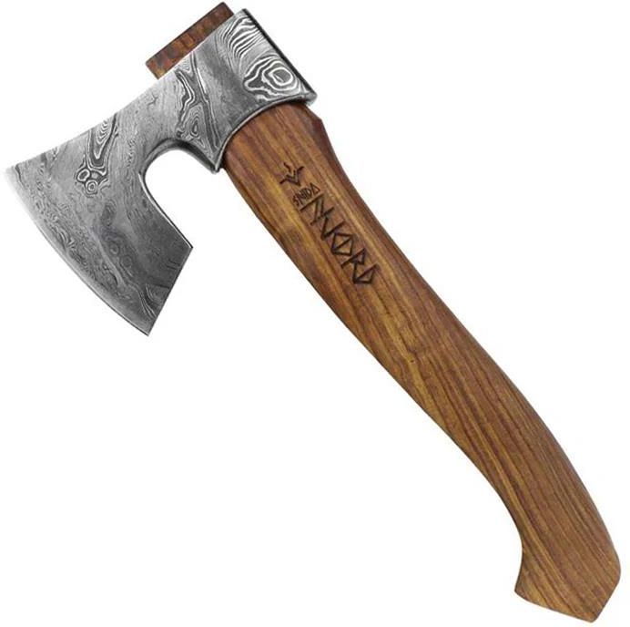 Toporek Njord Snida Damast - Medium (NJ SNIDA-D-M) Toporek Njord Snida Damast - Medium Toporek zrobiony z wytrzymałej i odpornej stali damastowej, idealny do rzeźbienia oraz obróbki drewna. Zaprojektowany wgłębienie głowicy charakteryzuje się gładkością oraz zaokrągleniem, co umożliwia komfortowy chwyt podczas dokładnego rzeźbienia. Końcowa warstwa ten toporek pokryty jest mieszanką ochronną z wosku pszczego oraz oleju lnianego gwarantując długą żywotność. W komplecie z ręcznie uszytą czarną skórzaną pochwą i etui, idealnym do przenoszenia i bezpiecznego przechowywania. Podsumowanie kluczowych cech: z użyciem stali damastowej rękojeść wykonana z drewna pallisander gładko wykończone wgłębienie w głowicy zabezpieczenie woskiem pszczelim i olejem lnianym czarne skórzane etui pochwa do przechowywania Dane techniczne Stal: damast Długość ostrza: 10 cm Długość rękojeści: 28 cm Długość całkowita: 33 cm Waga: 653 g Producent: Njord, Szwecja
