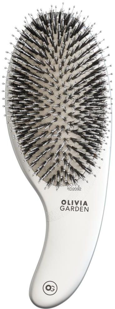 Szczotka Olivia Garden Expert Care Curve z mieszanym włosiem dzika do rozczesywania i stylizacji włosów srebrna Cechy Szczotka do rozczesywania włosów i codziennej stylizacji Mieszane włosie nylonowe z 100% naturalnym włosiem dzika Wygładza włosy podczas stylizacji i nadaje im połysk oraz objętość …