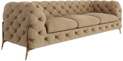 %description% WYMIARY Szerokość: 243 cm Głębokość: 100 cm Wysokość: 73 cm Wysokość siedziska: 45 cm Głębokość siedziska: 57 cm TKANINY Aksamit Riviera KOLOR PODSTAWY czarny chrom złoty Pikowana sofa 3-osobowa Chesterfield Chloe Bis ciepły beż na złotych nóżkach Marzy Ci się stylowo i zarazem …