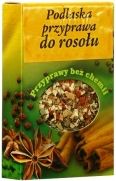 PRZYPRAWA DO ROSOŁU BEZGLUTENOWA 50g - DARY NATURY Przyprawa do rosołu bezglutenowa od Darów Natury to mieszanka ziół i przypraw, która nada Twojemu rosołowi wyjątkowego smaku i aromatu. W składzie znajdziesz tylko naturalne składniki, bez dodatku glutenu i innych sztucznych substancji. Dzięki temu jest ona bezpieczna dla osób z alergiami lub nietolerancjami glutenu. Ta przyprawa to idealny dodatek do rosołu, ale sprawdzi się także jako dodatek do innych potraw. Dzięki niej Twoje dania nabiorą wyjątkowego charakteru i smaku. Opakowanie zawiera 50 g przyprawy, wystarczającej na wiele porcji pysznego rosołu. Spróbuj i przekonaj się, jak wiele może zdziałać naturalna mieszanka ziół i przypraw od Darów Natury. SKŁADNIKI cebula, tymianek, lubczyk liść,koperek, SELER korzeń, ziele angielskie, liść laurowy, pietruszka korzeń, marchew, por, pieprz czarny (w różnych proporcjach) OPIS Przyprawa do rosołu z powodzeniem może zastąpić kotki rosołowe wzbogacając danie pięknym bulionowo-ziołowym aromatem. ZALECANE WARUNKI PRZECHOWYWANIA Przechowywać w suchym miejscu.