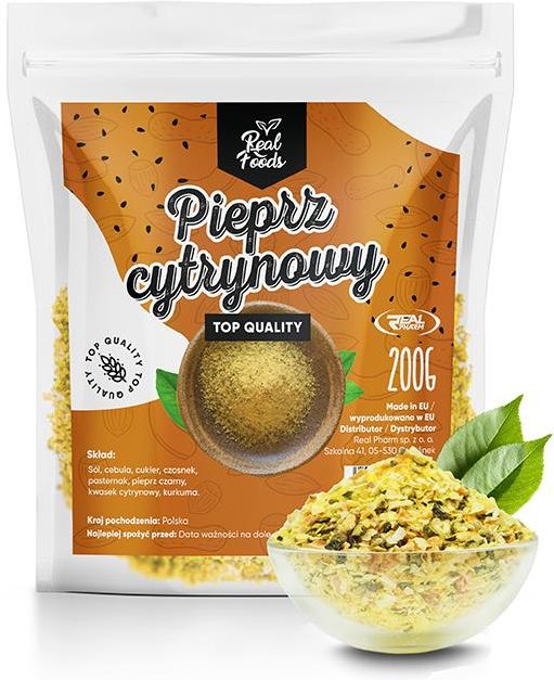 Real Foods Naturalny Pieprz Cytrynowy 200g Real Foods Pieprz Cytrynowy to mieszanka łącząca w sobie pikantność pieprzu czarnego z cytrynowym aromatem. Mieszanka pieprzu i soli z dodatkiem kwasku cytrynowego i kurkrumy tworzy aromatyczną przyprawę, która powinna znaleźć się u każdego wielbiciela gotowania. Intensywny smak i aromat pieprzu cytrynowego idealnie współgra w daniach rybnych, mięsnych i potrawach wegańskich. Nadaje potrawom świeżość i aromatyczny smak. Produkt pakowany w opakowanie typu doypack ze struną - dzięki temu możemy zamykać i otwierać przy zachowaniu świeżości produktu! W naszej szerokiej ofercie znajdziesz także pozostałe produkty marki Real Foods. Sprawdź nasz cały asortyment! Czekają na Ciebie różnego rodzaju witaminy, minerały, grzyby witalne, ekstrakty roślinne, adaptogeny, produkty poprawiające pracę mózgu oraz preparaty polepszające wytrzymałość i regenerację w sporcie. Skład: Sól, cebula, cukier, czosnek, pasternak, pieprz czarny, kwasek cytrynowy, kurkuma. Opakowanie: 200 g