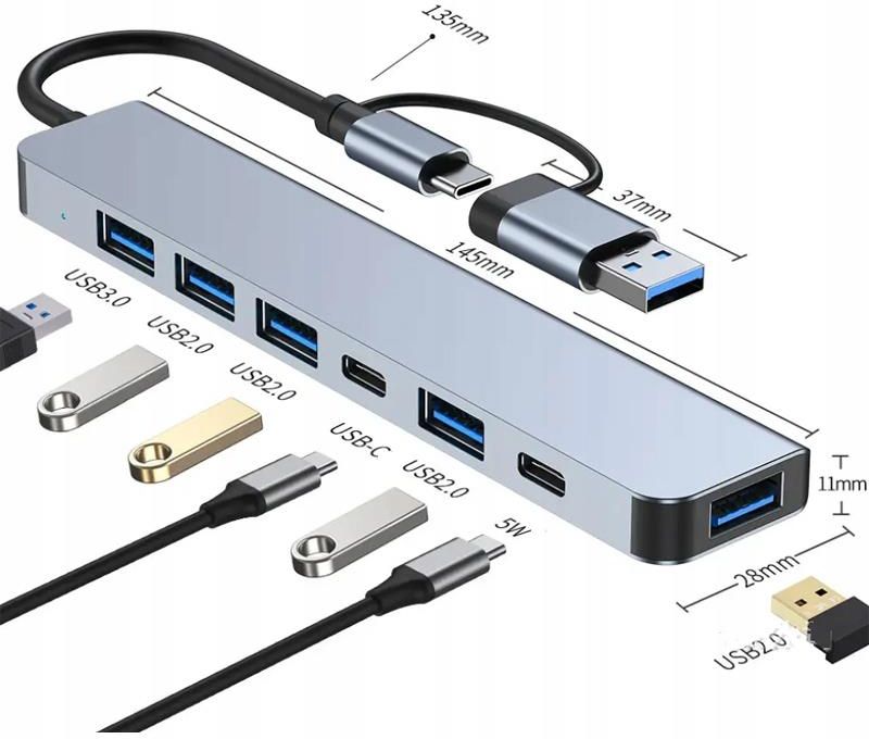 Hub USB TSG-163 7-Portowy USB C/USB A Stacja Dokująca (9W, Szybki Transfer) 7-Portowy Hub USB ViO TSG-163 to kompaktowy i wydajny adapter, stworzony dla użytkowników, którzy potrzebują znacznego rozszerzenia standardowych portów w swoim laptopie lub komputerze stacjonarnym. Dzięki podwójnemu interfejsowi (wejścia USB-A i USB-C) oraz 7 funkcjonalnym portom, zapewnia uniwersalne i stabilne połączenie dla całej Twojej peryferii i urządzeń mobilnych. Model łączy wysoką prędkość transferu danych, wytrzymały aluminiowy korpus oraz plug & play, gwarantując bezproblemową i szybką pracę. Ta funkcjonalna stacja dokująca wyposażona jest w kompletny zestaw złączy, obejmujący porty USB 3.0 do szybkiego transferu danych (do 5 Gb/s), standardowe USB 2.0 do myszy i klawiatur, złącza USB-C dla nowoczesnych urządzeń, a także port PD do ładowania o mocy do 5W. Taka kombinacja pozwala na jednoczesne podłączenie zewnętrznego dysku, pamięci flash, drukarki, myszki i klawiatury, przy jednoczesnym zasilaniu telefonu. Hub działa w trybie Plug & Play, co oznacza, że nie wymaga instalacji sterowników i jest natychmiast gotowy do użycia z systemami Windows, macOS i Linux. Uniwersalna Kompatybilność i Aluminiowa Konstrukcja Hub TSG-163 jest wyjątkowo wszechstronny dzięki obsłudze zarówno interfejsu USB-A, jak i nowoczesnego USB-C, co czyni go jednym, uniwersalnym adapterem dla starszych PC oraz najnowszych ultrabooków i tabletów. Elegancki, minimalistyczny korpus został wykonany z aluminium, które nie tylko nadaje urządzeniu stylowy wygląd, ale także zapewnia efektywne odprowadzanie ciepła nawet przy jednoczesnym obciążeniu wszystkich portów. Dzięki kompaktowym rozmiarom i lekkości, jest to mobilna centra do pracy w biurze, na uczelni i w podróży. Kluczowe Korzyści Adaptera 7-Portowego Wysoka Prędkość:Porty USB 3.0 umożliwiają transfer danych do 5 Gb/s (idealne dla plików wideo i zdjęć). Wielofunkcyjność:7 zróżnicowanych portów (USB 3.0/2.0/C/PD) do wszystkich Twoich urządzeń. Dualny Interfejs:Kompatybilność zarówno z laptopami na USB-A, jak i USB-C. Trwała Obudowa:Aluminiowy korpus zapewnia odprowadzanie ciepła i długą żywotność. Łatwość Użycia:Plug & Play – gotowość do pracy bez konieczności instalowania dodatkowych sterowników. Zasilanie PD: Dedykowany port do szybkiego ładowania (do 5W) podłączonych urządzeń mobilnych.