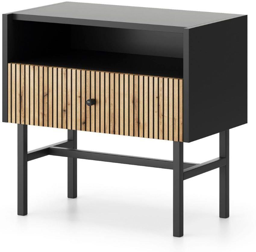 Szafka nocna Diva z lamelowym frontem to nowoczesny design i naturalne akcenty.Szafka posiada czarną konstrukcją i oryginalny lamelowy front w kolorze naturalnego drewna.To doskonałe połączenie nowoczesnej formy z ciepłym, przytulnym akcentem.Idealna do wnętrz w stylu boho, skandynawskim, japandi, …